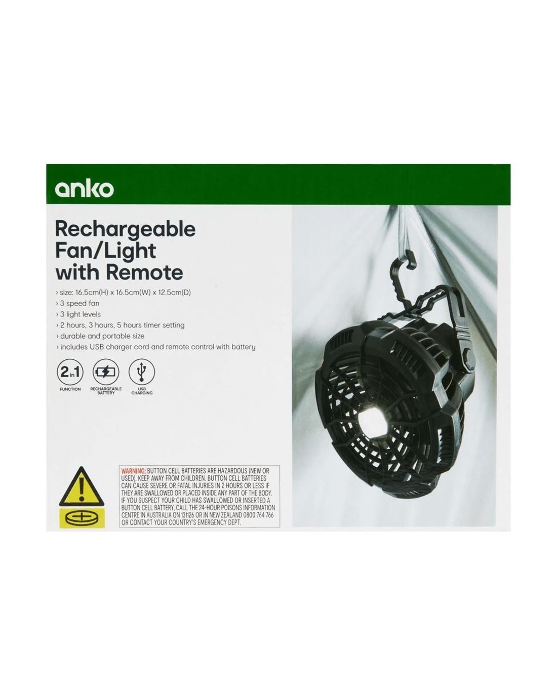 The Rechargeable Fan/Light with Remote is a versatile cooling and lighting solution - a great addition to your camping accessories.