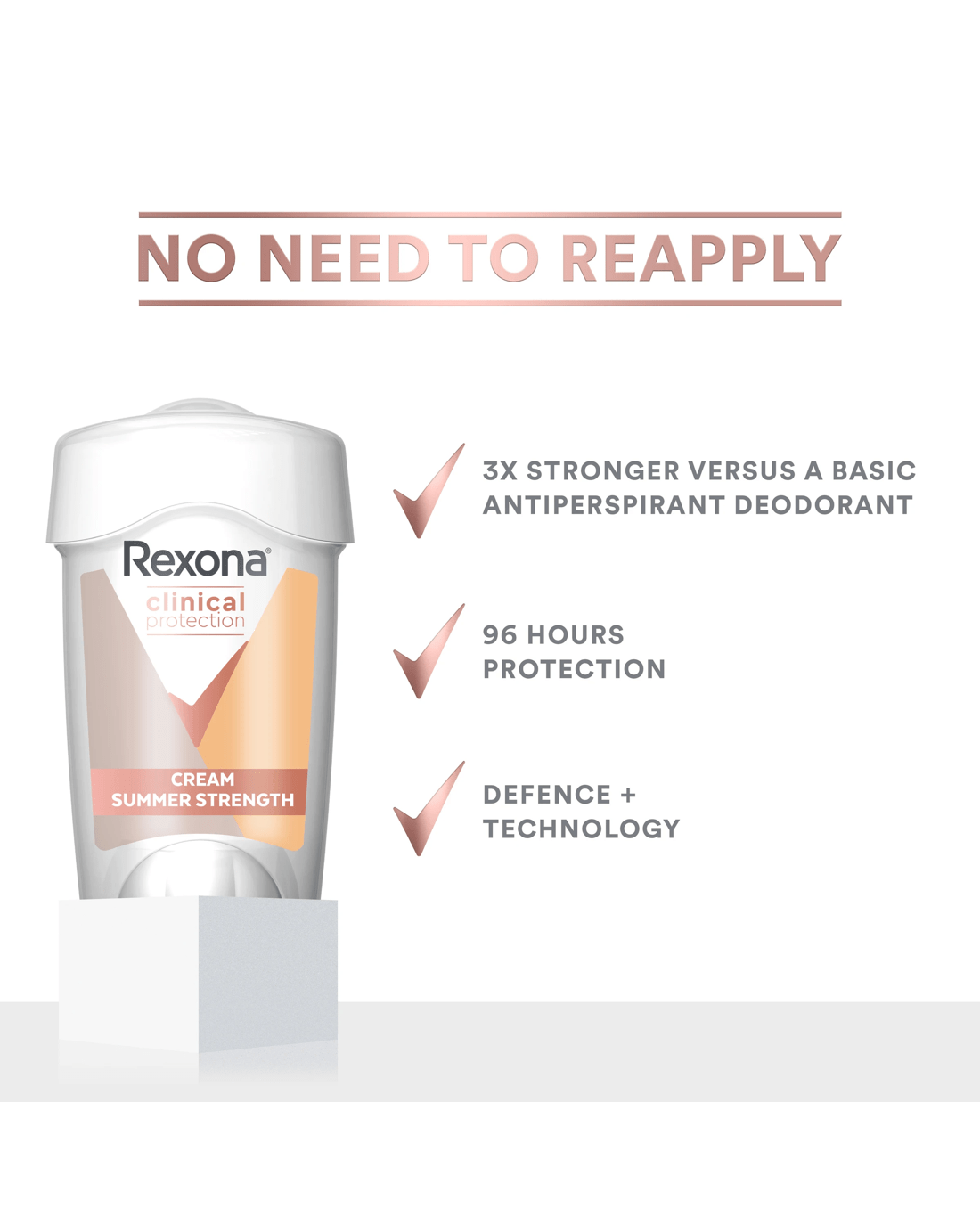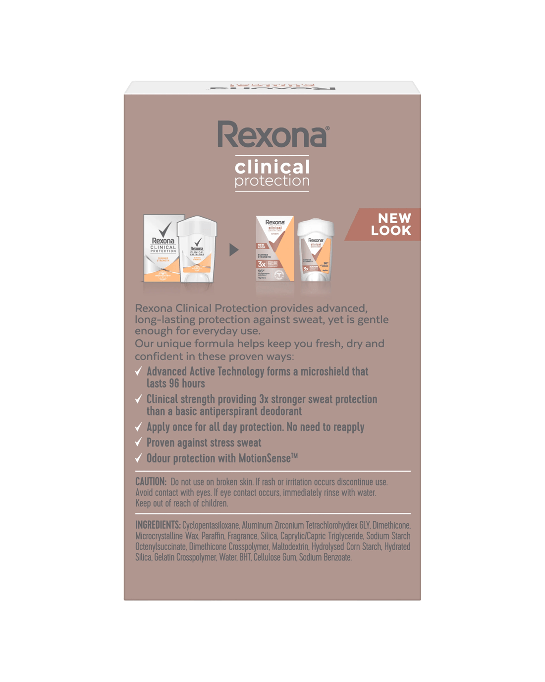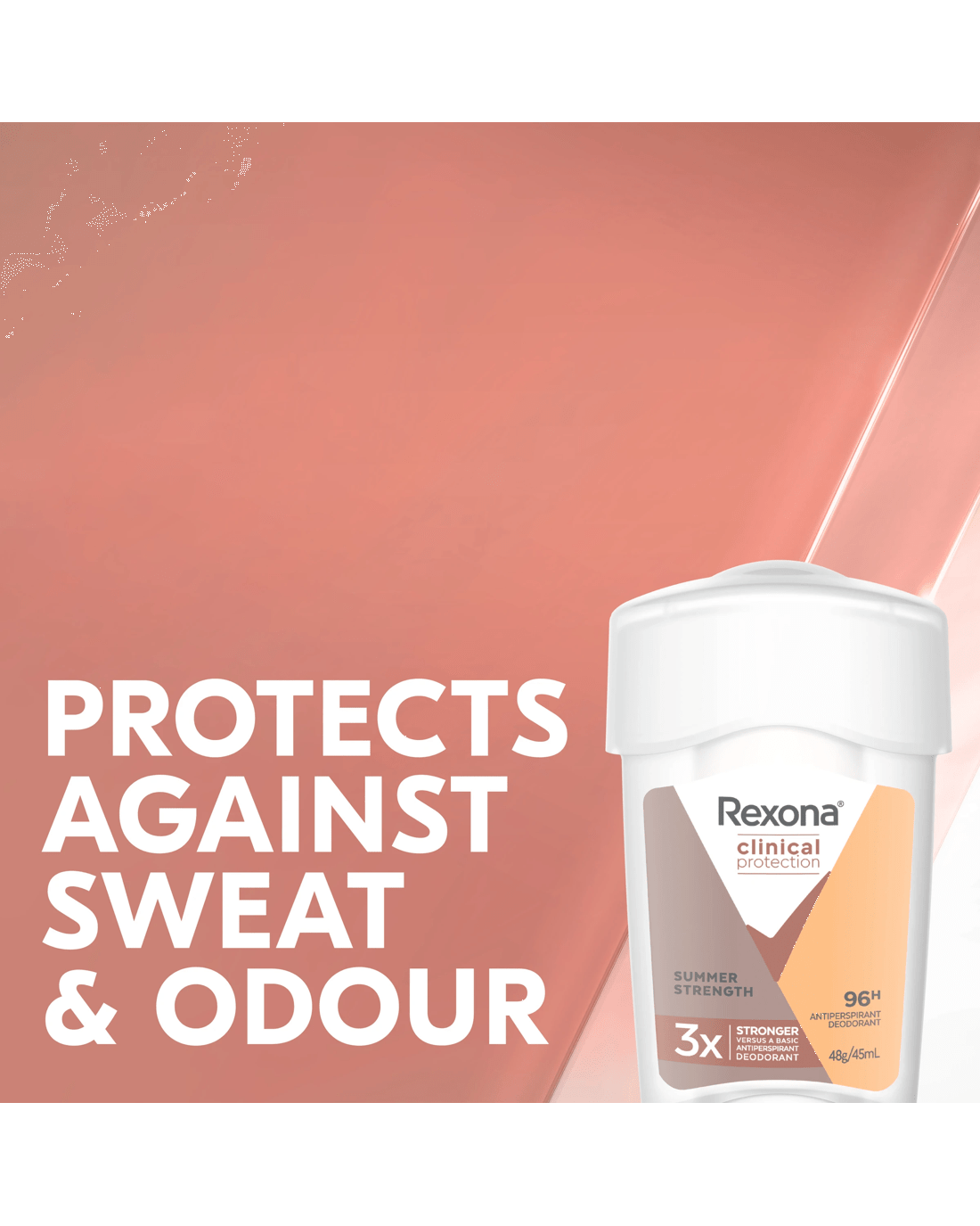 Everybody sweats, sure. But not everybody sweats in the same way. Some of us sweat more but still want to live life without the stress of stickiness and sweat patches. That?s why we?ve developed Rexona Women Summer Strength Clinical Protection Antiperspirant, offering 3x more sweat protection than a basic antiperspirant deodorant, with a clean, exotic scent. Advanced Active technology forms an anti-sweat microshield that keeps you fresh, dry and confident for up to 96 hours. Better still, our innovative MotionSense technology releases bursts of fresh, invigorating fragrance when you need it most on those long, hot summer days. It works like this: unique microcapsules sit on the surface of your skin. When you move, friction breaks those microcapsules releasing more fragrance. So, the more you move, the more it protects. When you work hard, Rexona works harder. With a unique blend of skin-moisturising ingredients, the antiperspirant deodorant stick formula is gentle enough for everyday use. Grab this stick deodorant for women to get all-day freshness and 96-hour protection that works in sync with your body for nonstop confidence from morning to night. For optimum sweat protection, apply at night when your sweat glands are less active. Twist the bottom to release the cream with two clicks per underarm and smooth onto each underarm evenly. Rexona gives you all the backup you need. Rexona. It won?t let you down.