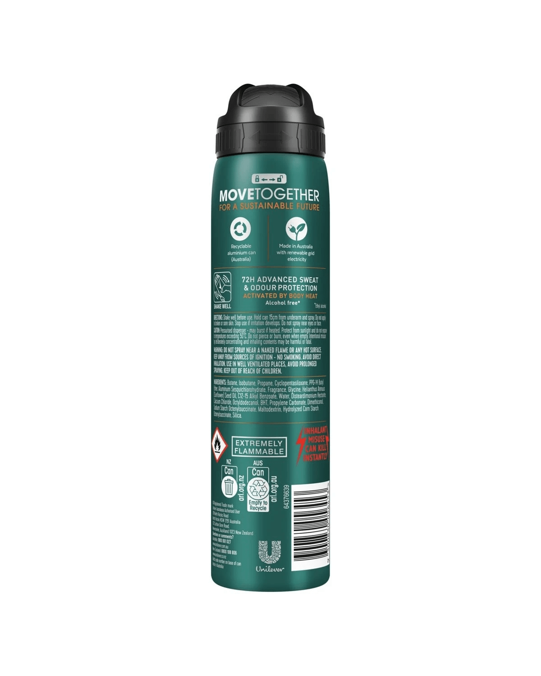Rexona Men Workout Advanced Protection Antiperspirant Deodorant Aerosol provides 72 hours of nonstop sweat and odour protection – giving you the confidence to start moving and take on the day. Our innovative MotionSense technology releases bursts of clean, fresh fragrance when you need it most. It works like this: unique microcapsules sit on the surface of your skin. When you move, friction breaks those microcapsules, releasing more fragrance. So, the more you move, the more it protects. When you work hard, Rexona works harder. Grab this antiperspirant deodorant for men to get all-day freshness and 72-hour protection that works in sync with your body for nonstop confidence from morning to night. For optimum sweat protection, apply daily to clean and dry underarms. To use, shake well and spray 15 cm away from underarms, then you’re good to go. No need to reapply. Rexona gives you all the backup you need. Rexona. It won’t let you down. As part of our efforts to move together for a sustainable future, we’re increasing our use of reusable materials and making it easier for you to recycle our packaging. Our deodorant spray is made in Australia with renewable grid electricity and comes in a recyclable aluminium can – please recycle when empty.