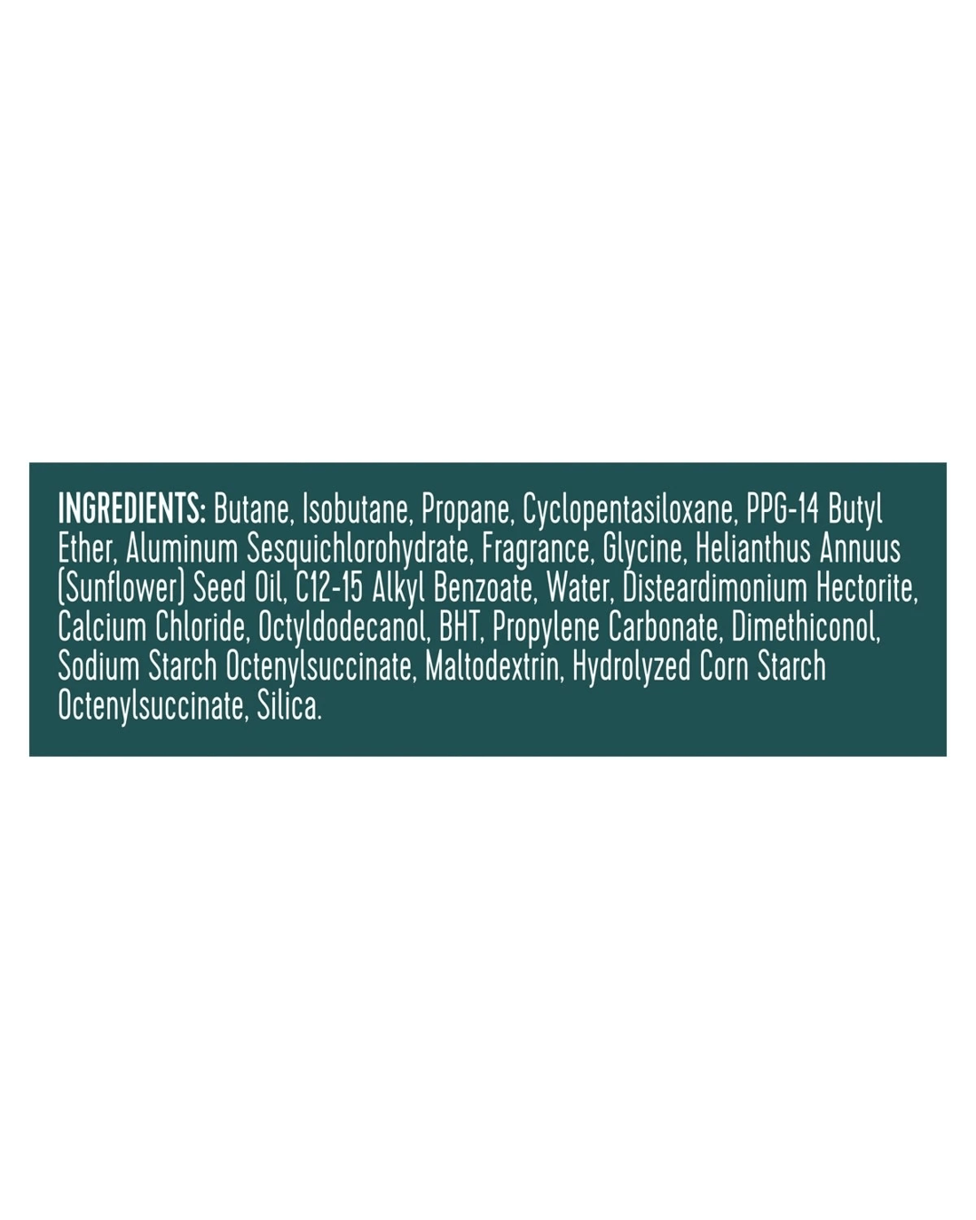 - Ingredients: Butane, Isobutane, Propane, Cyclopentasiloxane, Aluminum Sesquichlorohydrate, Fragrance, PPG-14 Butyl Ether, Glycine, Water, Disteardimonium Hectorite, Calcium Chloride, Bht, Propylene Carbonate, Dimethiconol, Caprylic/Capric Triglyceride, Sodium Starch Octenylsuccinate, Maltodextrin, Hydrated Silica, Gelatin Crosspolymer, Hydrolyzed Corn Starch Octenylsuccinate, Sodium Benzoate, Silica, Cellulose Gum