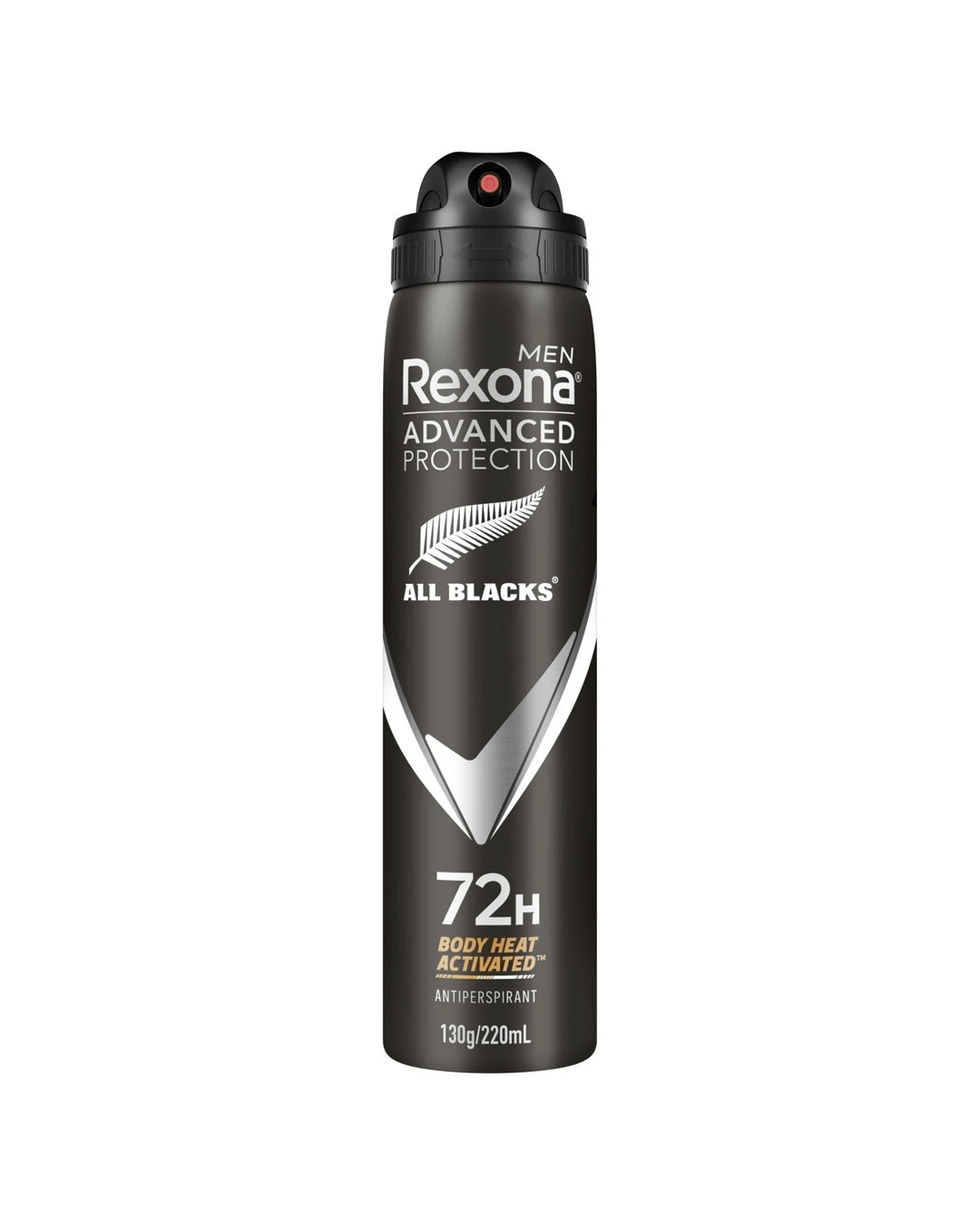 Rexona's Advanced Protection All Blacks 220ml antiperspirant deodorant is specially formulated to keep men protected from sweat and odour for up to 72 hours, and keep them fresh throughout the day.