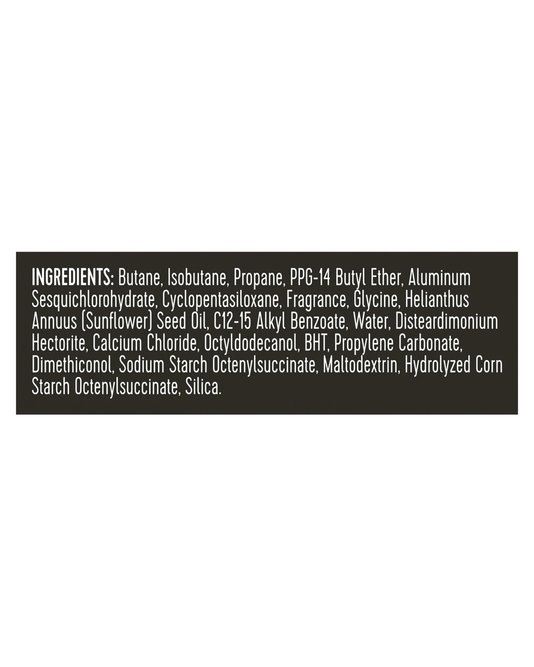 - Ingredients: Butane, Isobutane, Propane, Cyclopentasiloxane, Aluminium Sesquichlorohydrate, Fragrance, PPG-14 Butyl Ether, Glycine, Water, Disteardimonium Hectorite, Calcium Chloride, BHT, Propylene Carbonate, Dimethiconol, Caprylic/Capric Triglyceride, Sodium Starch Octenylsuccinate, Maltodextrin, Hydrated Silica, Gelatin Crosspolymer, Hydrolysed Corn Starch Octenylsuccinate, Sodium Benzoate, Silica, Cellulose Gum