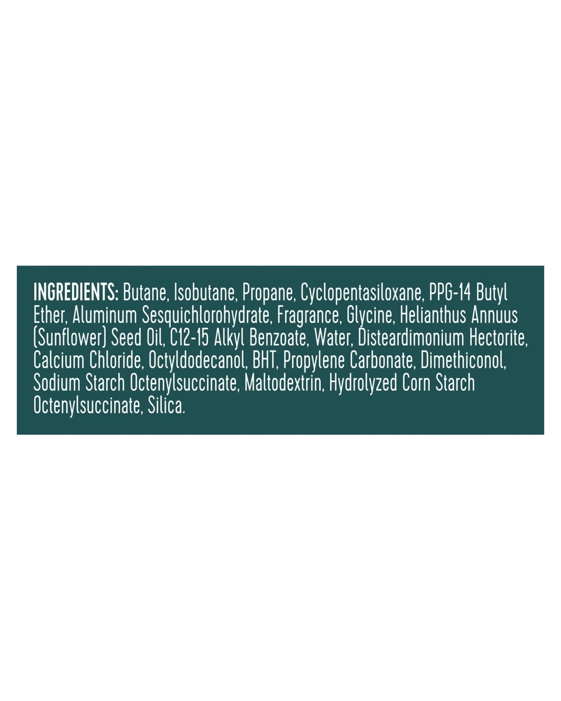 - Ingredients: Butane, Isobutane, Propane, Cyclopentasiloxane, PPG-14 Butyl Ether, Aluminum Sesquichlorohydrate, Fragrance, Glycine, Helianthus Annuus (Sunflower) Seed Oil, C12-15 Alkyl Benzoate, Water, Disteardimonium Hectorite, Calcium Chloride, Octyldodecanol, BHT, Propylene Carbonate, Dimethiconol, Sodium Starch Octenylsuccinate, Maltodextrin, Hydrolysed Corn Starch Octenylsuccinate, Silica