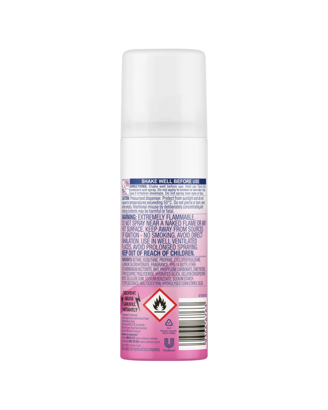 - Ingredients: Butane, Isobutane, Propane, Aluminum Chlorohydrate, Cyclopentasiloxane, Ppg-14 Butyl Ether, Fragrance, Disteardimonium Hectorite, Carpylic/Capric Triglyceride, Bht, Hydrated Silica, Gelatin Crosspolymer, Maltodextrin, Sodium Starch Octenylsuccinate, Hydrolysed Corn Starch, Cellulose Gum, Sodium Benzoate, Water, Propylene Carbonate, Silica.