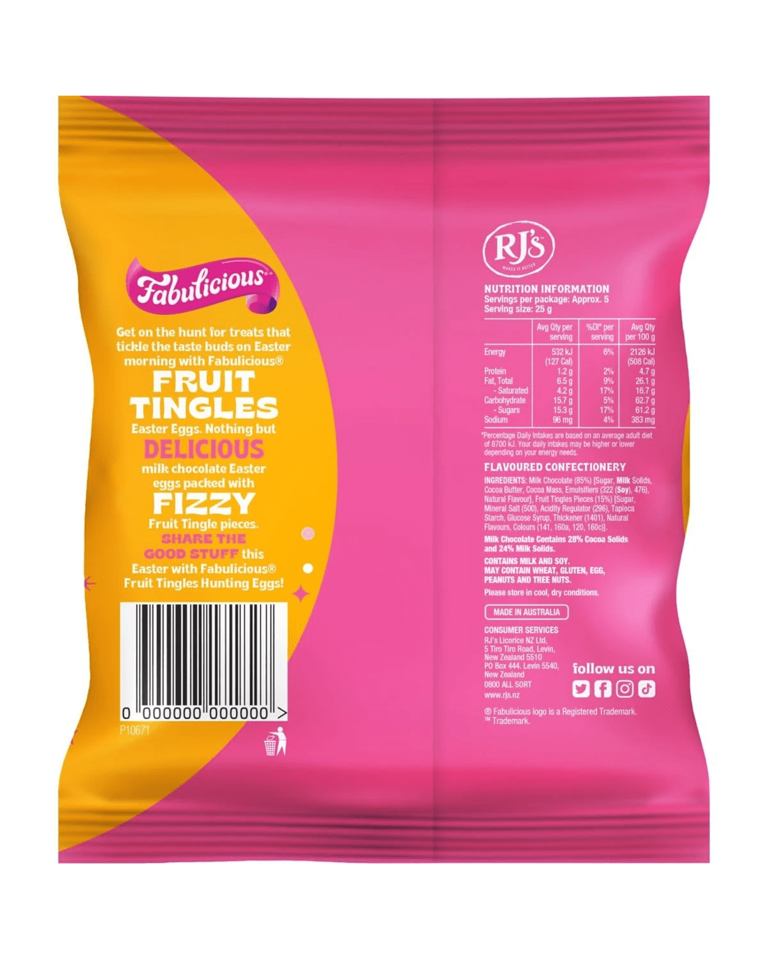 • Ingredients: Milk Chocolate (85%) [Sugar, Milk Solids, Cocoa Butter, Cocoa Mass, Emulsifiers (322 (Soy), 476), Natural Flavour], Fruit Tingles Pieces (15%) [Sugar, Mineral Salt (500), Acidity Regulator (296), Tapioca Starch, Glucose Syrup, Thickener (1401), Natural Flavours, Colours (141, 160a, 120, 160с)]