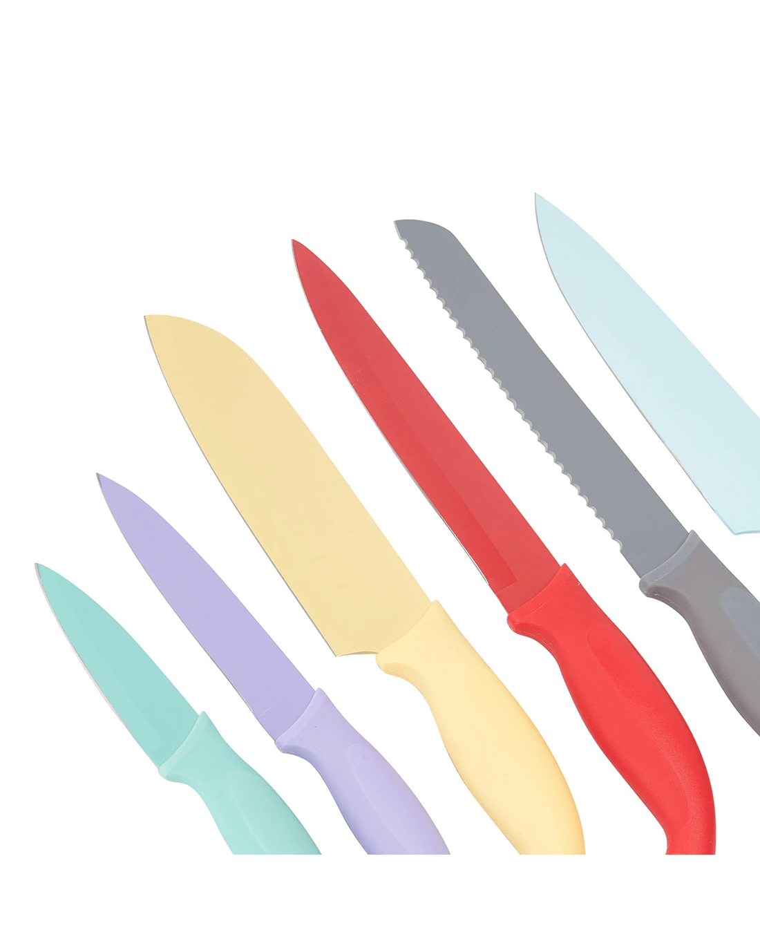 Stainless Steel Non-stick Blades: Each knife features a stainless steel blade with a non-stick coating that helps reduce food sticking during slicing and chopping.