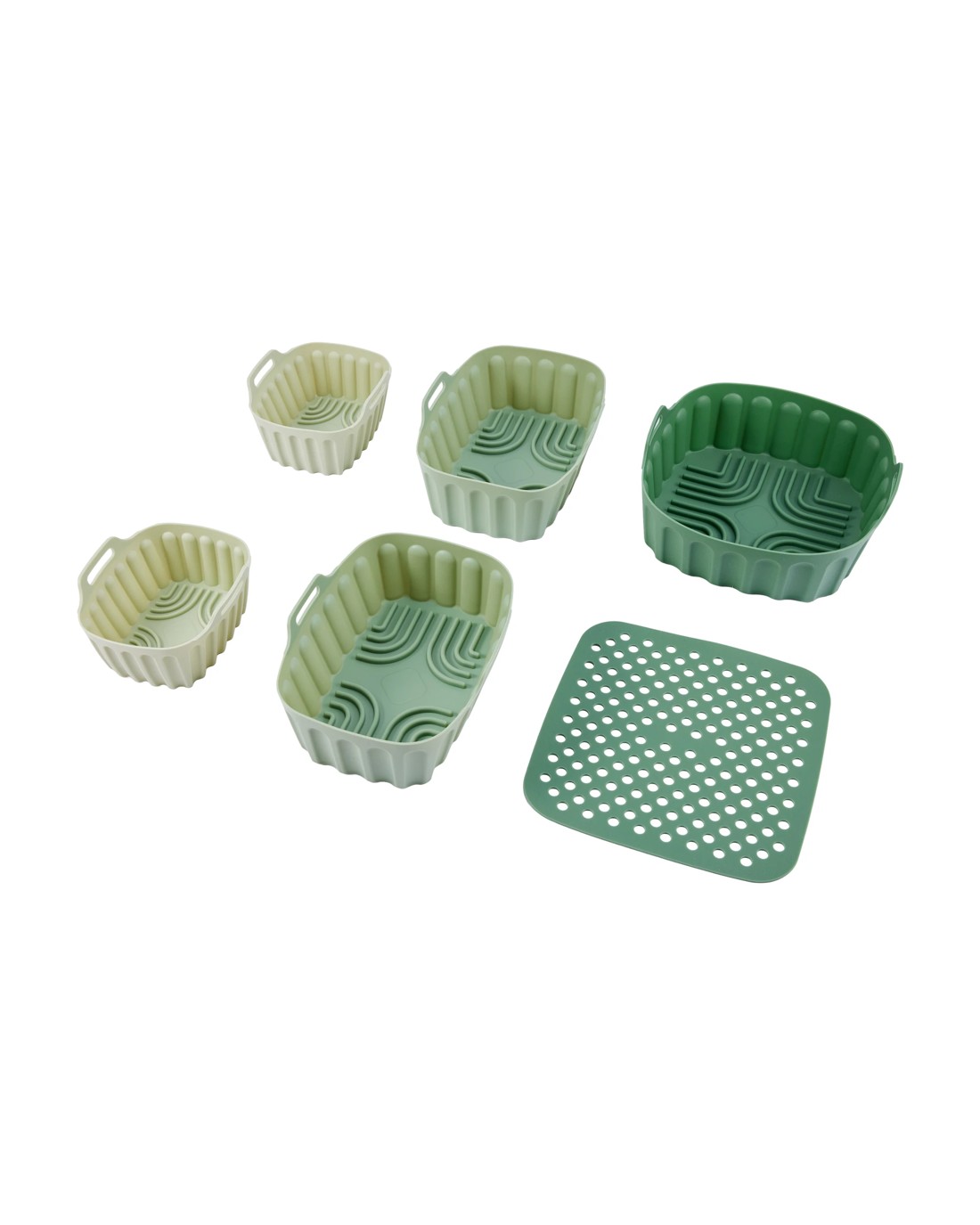 Set of 6 Silicone Air Fryer Trays Specifications- 1 x mat, 1 x large air fryer trays, 2 x medium air fryer trays and 2 x small air fryer trays