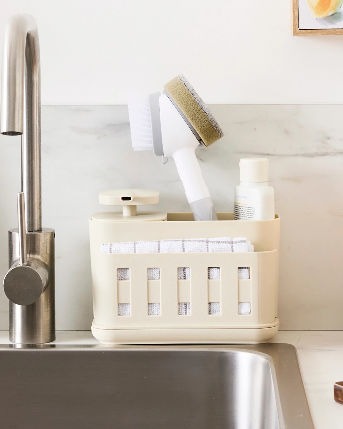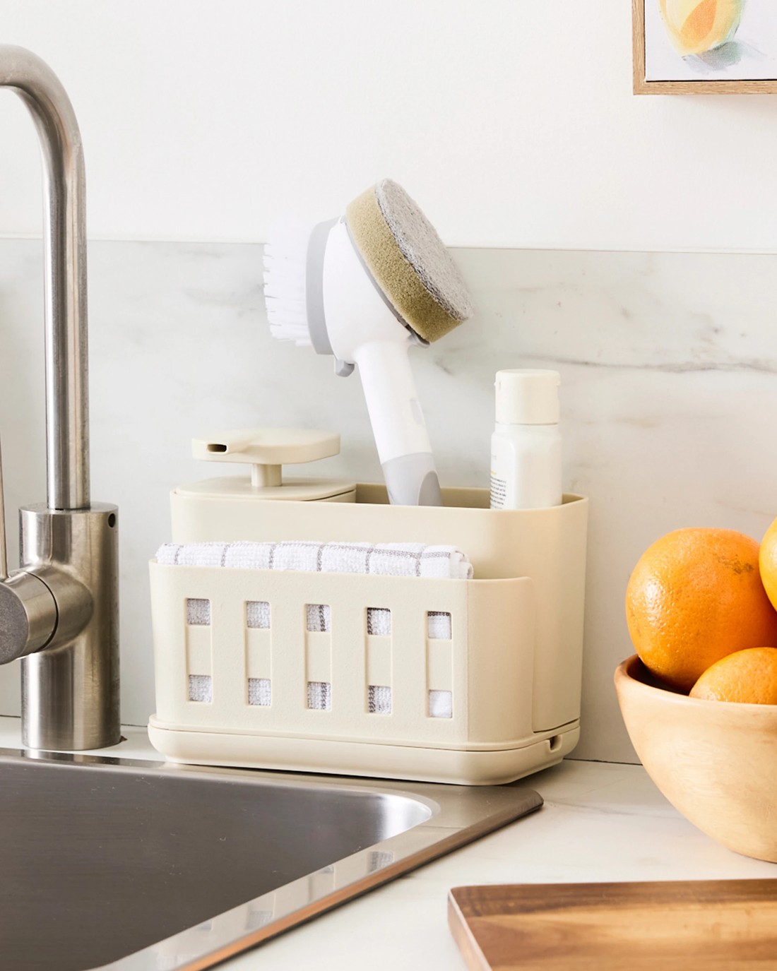 This Sink Caddy keeps sponges, brushes and more neatly arranged for a clutter-free sink area. Designed to maximise space and maintain easy access to everyday cleaning items.
