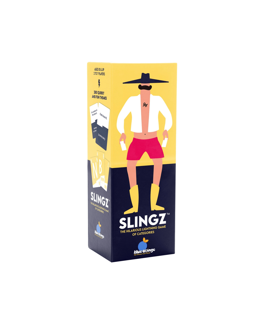 Deal five letters to each player and reveal a theme. All players rush to find words that fit the theme and begin with one of their letters. They sling their card, saying the word and look for more until three words are found. Then a new theme is revealed. The first to put down their five letters wins the round!