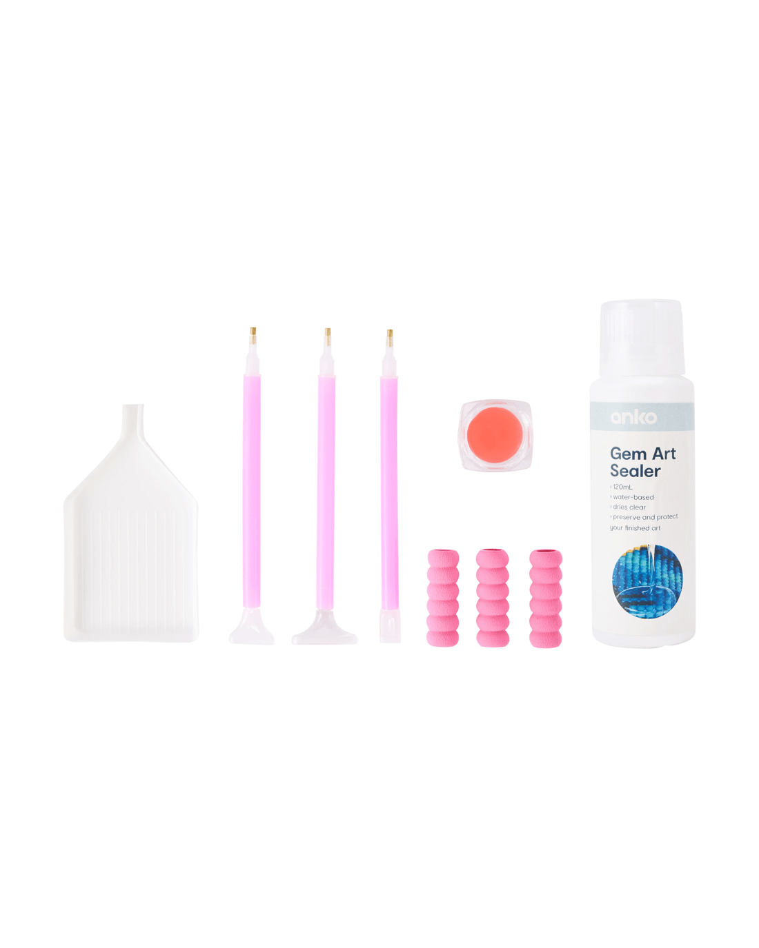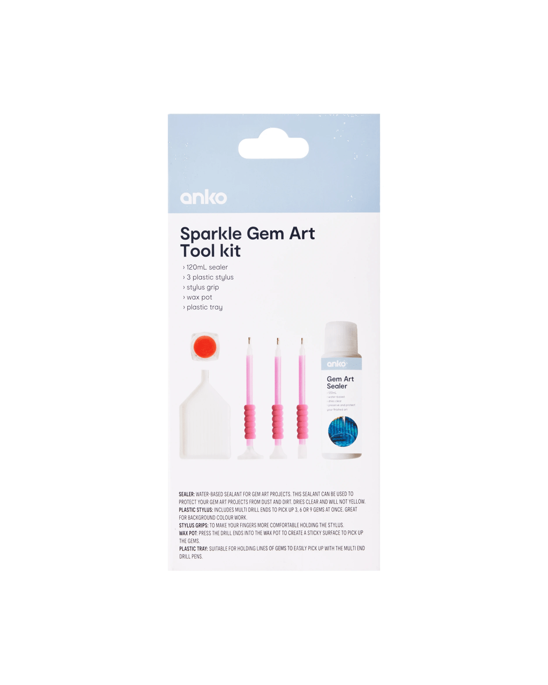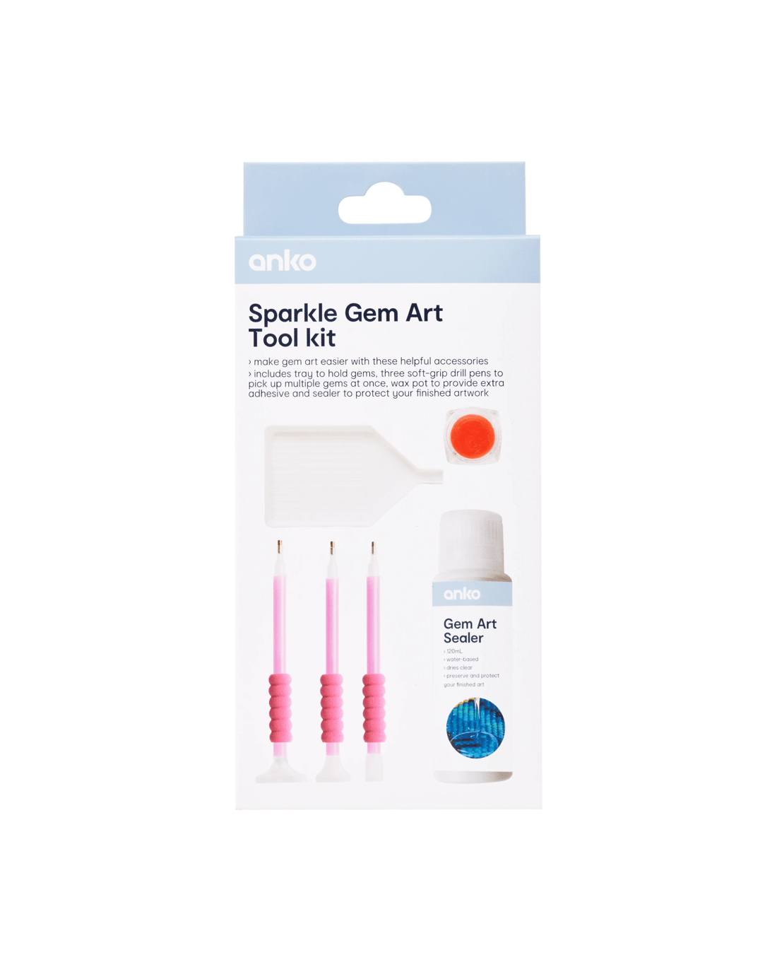 - Includes tray to hold gems, three soft-grip drill pens to pick up multiple gems at once, wax pot to provide extra adhesive and sealer to protect your finished artwork