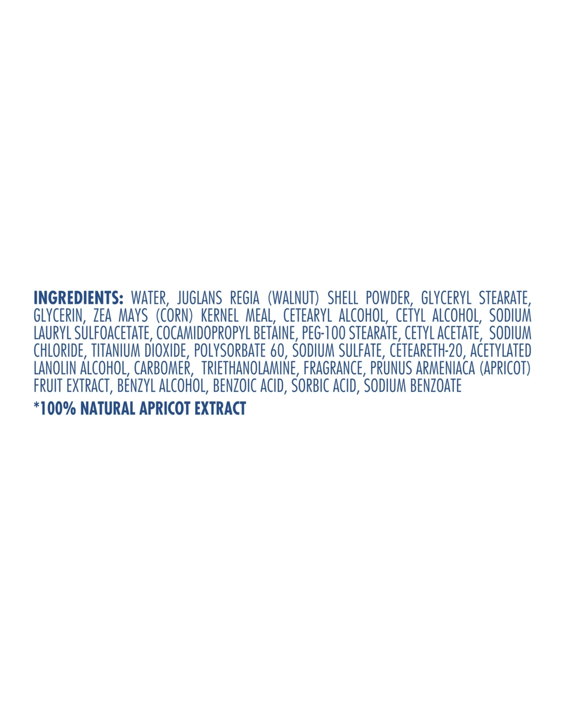 - Ingredients: Water, Juglans Regia (Walnut) Shell Powder, Glyceryl Stearate, Glycerin, Zea Mays (Corn) Kernel Meal, Cetearyl Alcohol, Cetyl Alcohol, Sodium Lauryl Sulfoacetate, Cocamidopropyl Betaine, Peg-100 Stearate, Cetyl Acetate, Sodium Chloride, Titanium Dioxide, Polysorbate 60, Sodium Sulfate, Ceteareth-20, Acetylated Lanolin Alcohol, Carbomer, Triethanolamine, Fragrance, Prunus Armeniaca (Apricot) Fruit Extract, Sodium Benzoate, Ppg-2 Methyl Ether, Phenethyl Alcohol and Methylisothiazolinone
