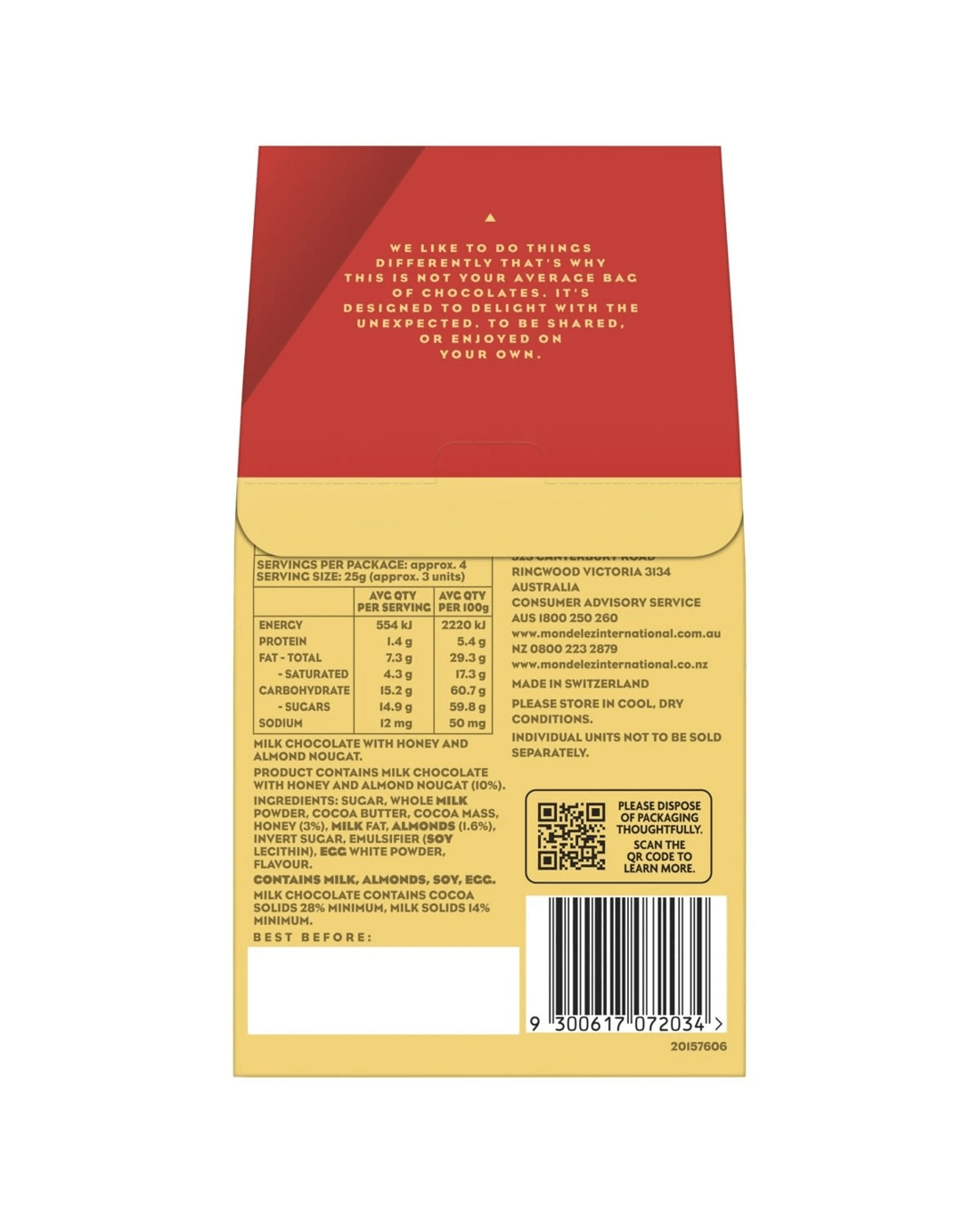 - Ingredients: Sugar, Whole Milk Powder, Cocoa Butter, Cocoa Mass, Invert Syrup, Honey (3%), Milk Fat, Almonds (1.6%), Emulsifier (Soy Lecithin), Egg White, Flavour