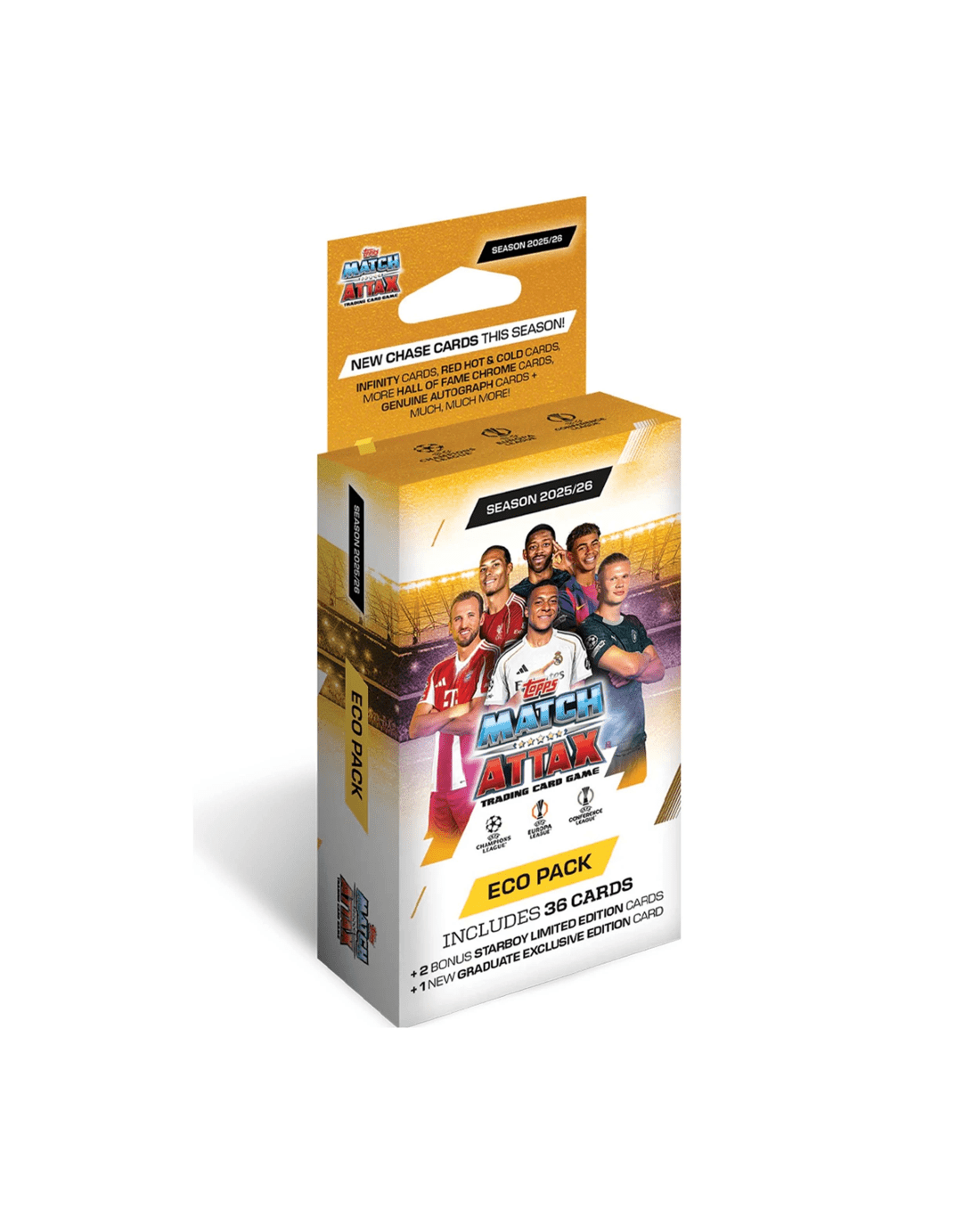 - Loaded with epic cards! Each Topps Match Attax 2025/26 Eco Hanger Pack includes 36 Match Attax cards, 2 random Star Boy Limited Editions and 1 The Graduates LE card - the perfect pack to boost your collection! Loaded with epic cards!
