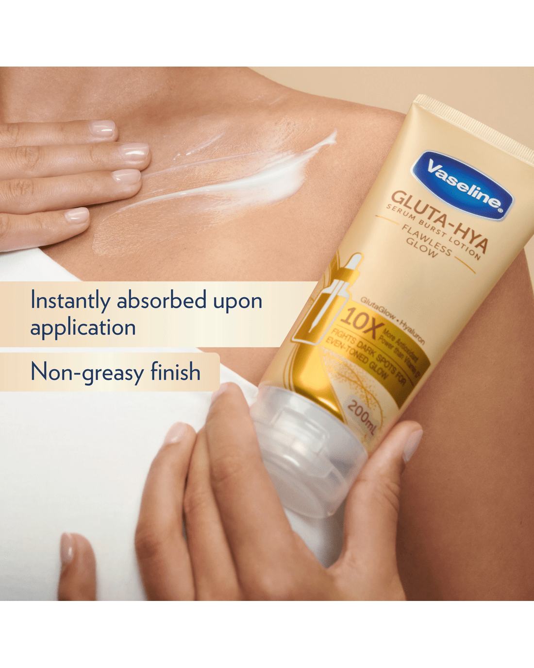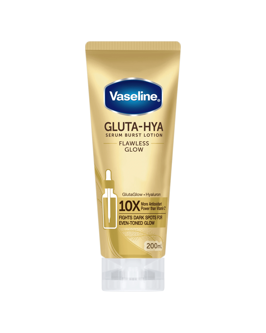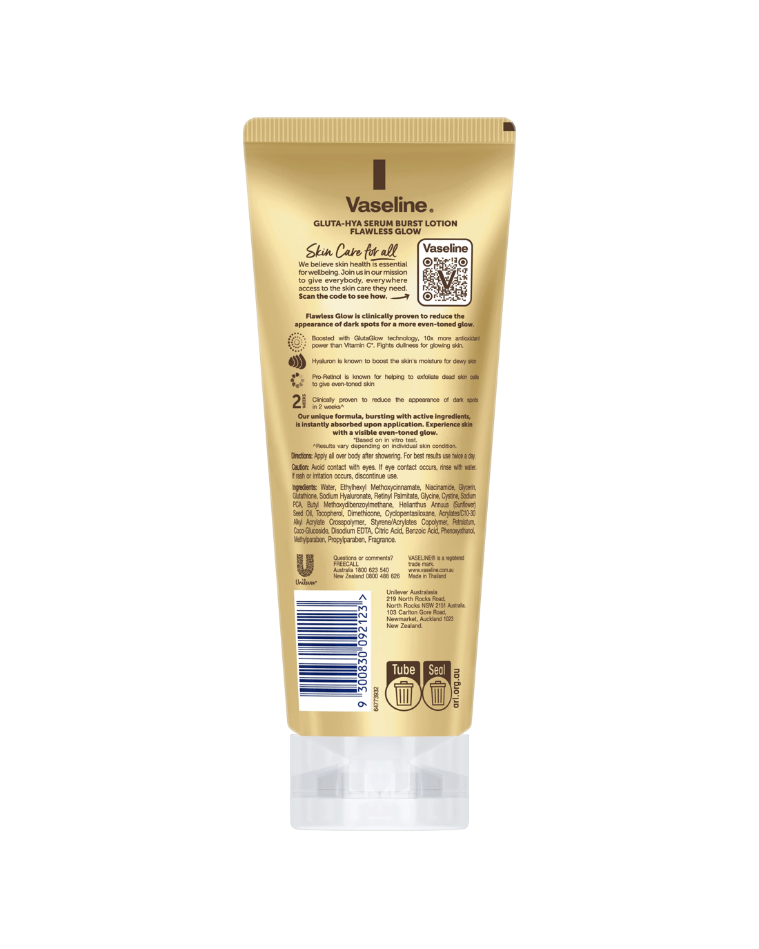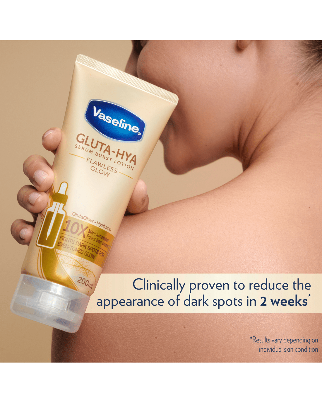 Achieve an even-toned glow with Vaseline Gluta-Hya Flawless Glow Serum Burst Lotion. Its unique formula is powered by GlutaGlow technology, with 10x more antioxidant power than Vitamin C*, to fight dullness for glowing skin. Our body lotion is also made with Hyaluronic Acid and Pro-Retinol to boost moisture and help exfoliate dead skin cells, resulting in more even-toned skin. This fast-absorbing, lightweight moisturiser is clinically proven to reduce the appearance of dark spots in 2 weeks^. Experience a visible even-toned glow. Vaseline has a range of moisturisers to help restore, soothe and nourish all skin types. We believe skin care is essential for wellbeing. That’s why we’re working towards giving everybody, everywhere, access to the skin care they need. Visit our website to learn more about our global partnership with Direct Relief.