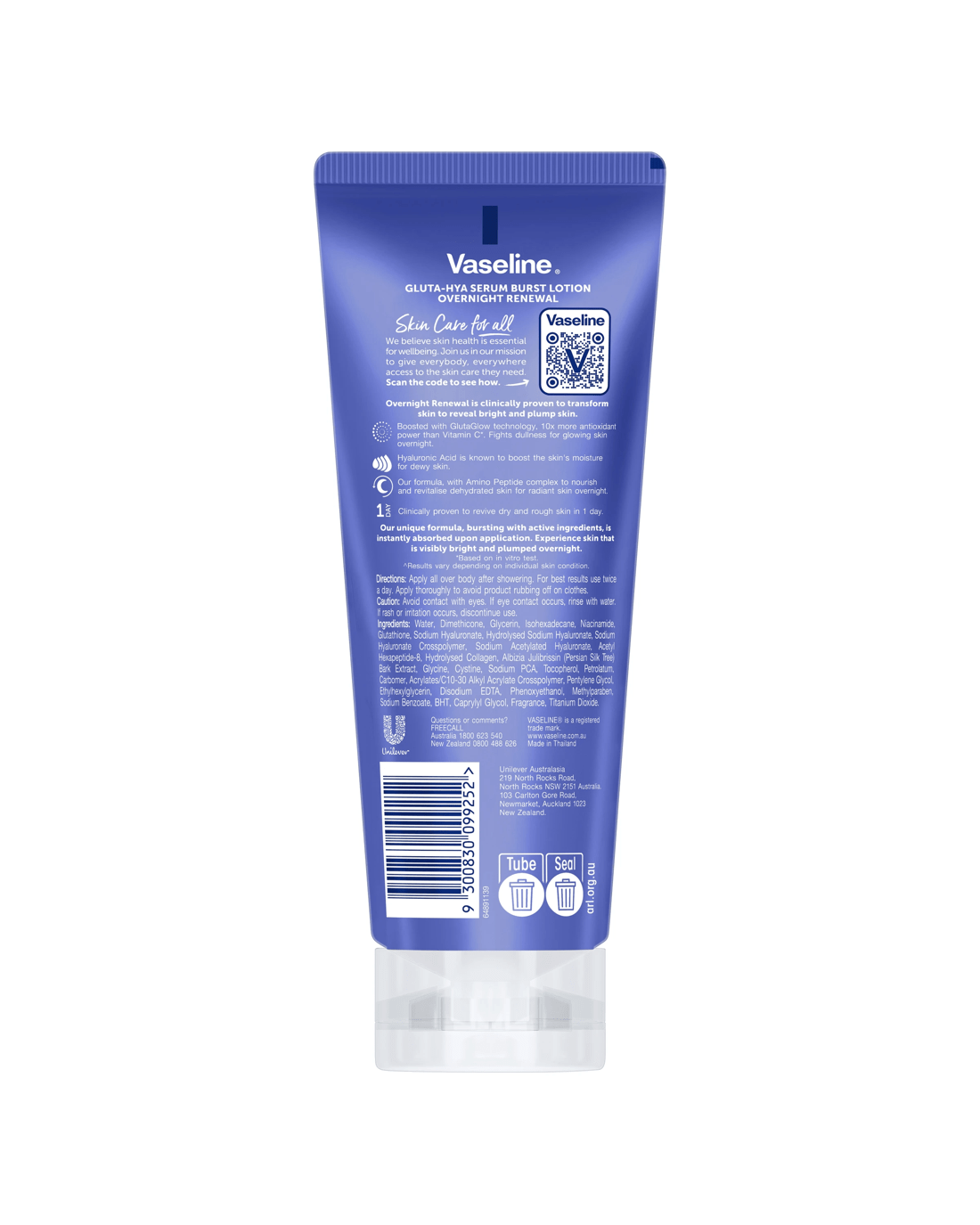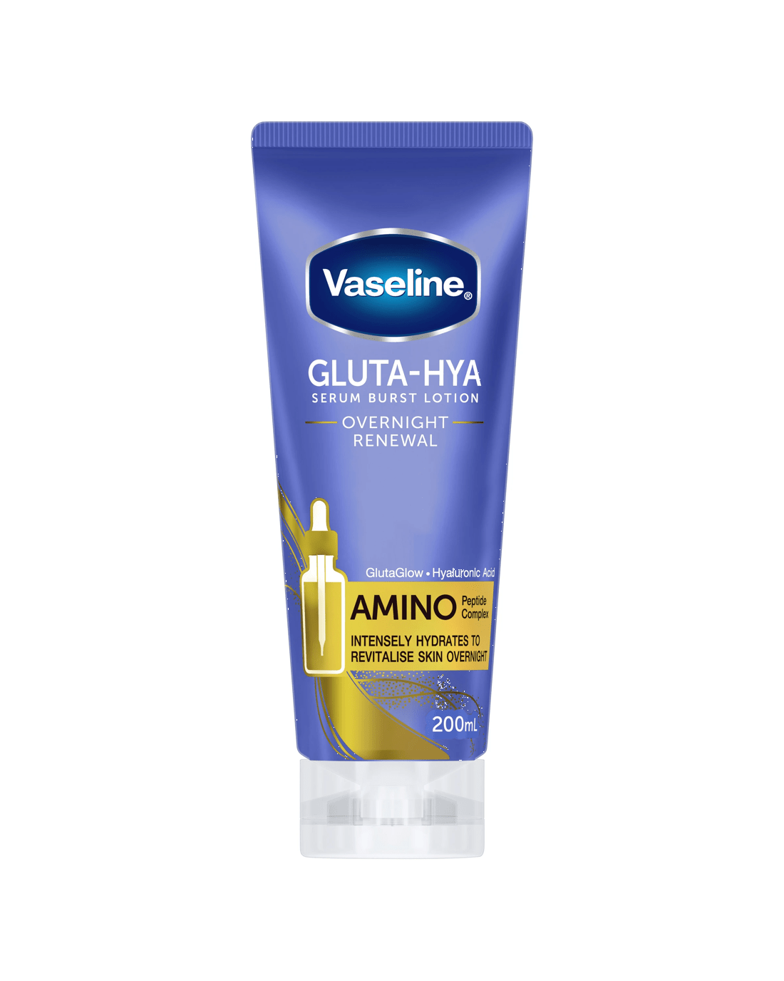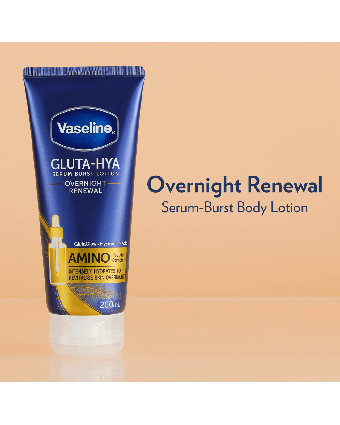 Intensely hydrate and revitalise your skin overnight with Vaseline Overnight Renewal Gluta-Hya Serum Burst Body Lotion. Its unique formula is powered by GlutaGlow technology, with 10x more antioxidant power than Vitamin C*, to fight dullness for glowing skin. Our body lotion is also made with Hyaluronic Acid and Amino Peptide Complex to boost moisture, provide nourishment and help plump up dehydrated skin. This fast-absorbing, lightweight moisturiser is clinically proven to revive dry and rough skin in just 1 day^. Experience visibly bright and plumped skin overnight. Vaseline has a range of moisturisers to help restore, soothe and nourish all skin types. We believe skin care is essential for wellbeing. That’s why we’re working towards giving everybody, everywhere, access to the skin care they need. Visit our website to learn more about our global partnership with Direct Relief.