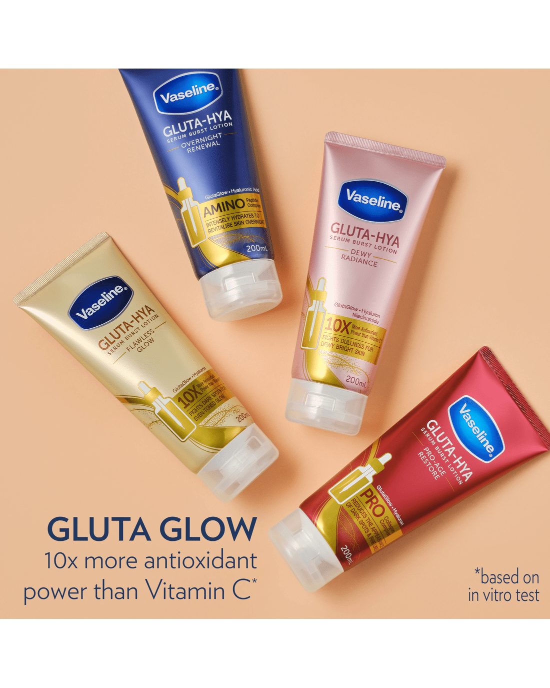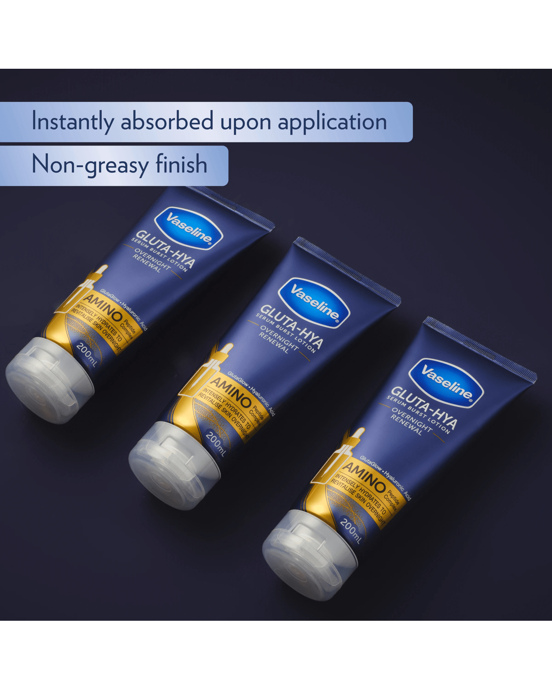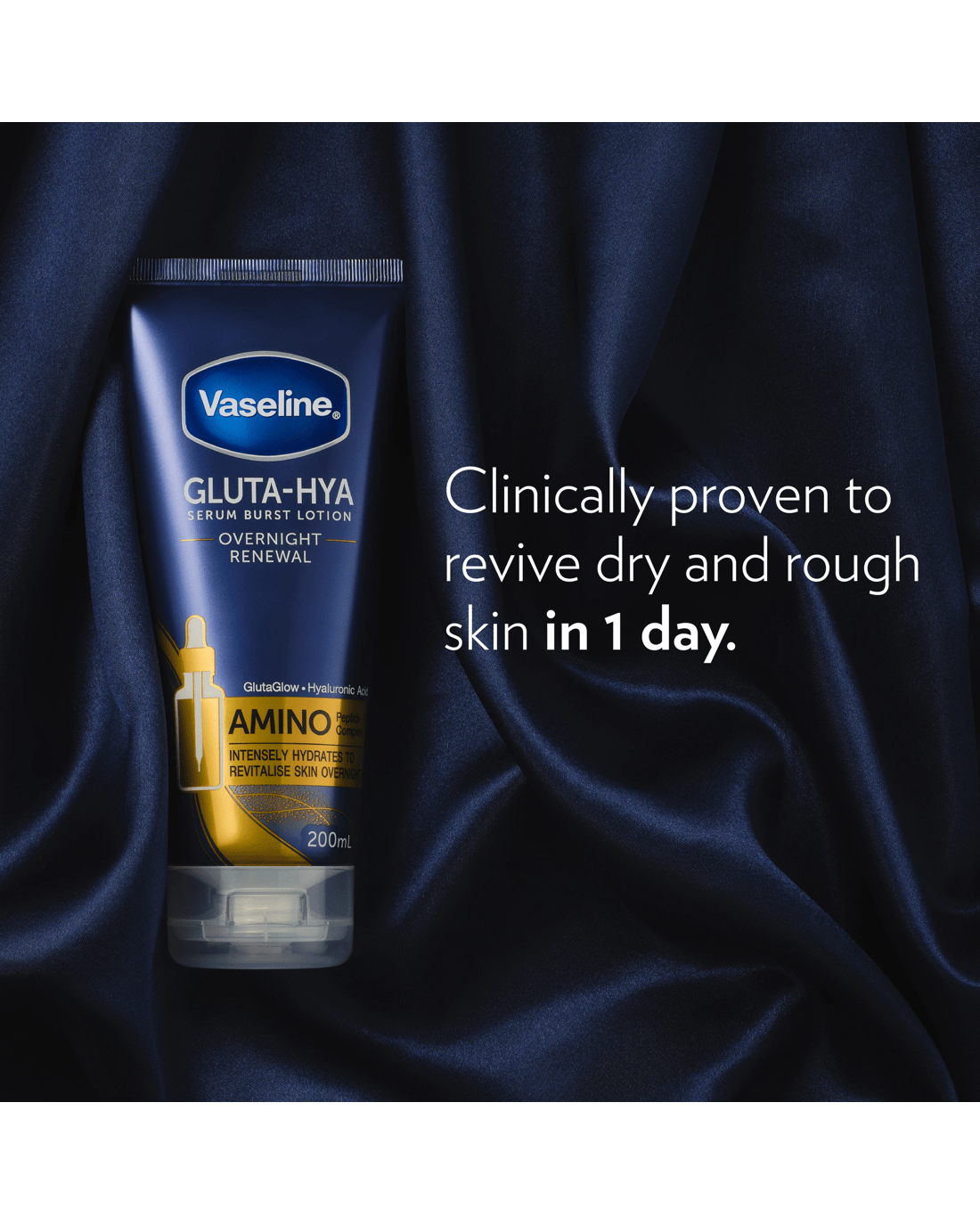 Intensely hydrate and revitalise your skin overnight with Vaseline Overnight Renewal Gluta-Hya Serum Burst Body Lotion. Its unique formula is powered by GlutaGlow technology, with 10x more antioxidant power than Vitamin C*, to fight dullness for glowing skin. Our body lotion is also made with Hyaluronic Acid and Amino Peptide Complex to boost moisture, provide nourishment and help plump up dehydrated skin. This fast-absorbing, lightweight moisturiser is clinically proven to revive dry and rough skin in just 1 day^. Experience visibly bright and plumped skin overnight. Vaseline has a range of moisturisers to help restore, soothe and nourish all skin types. We believe skin care is essential for wellbeing. That’s why we’re working towards giving everybody, everywhere, access to the skin care they need. Visit our website to learn more about our global partnership with Direct Relief.