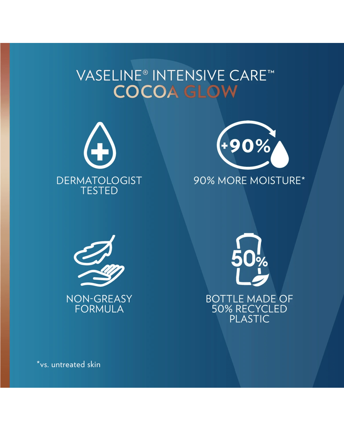 Vaseline Intensive Care Cocoa Glow Lotion is clinically tested to provide 90% more moisture (vs. untreated skin). It absorbs fast without leaving any residue or greasy feel. What's more, it provides 48 hours of moisture for the nourishing care your skin craves. Use this dermatologist-tested body lotion daily on dry and rough skin for stronger, noticeably healthier-looking skin. Simply apply to your skin, preferably after a shower, for long-lasting moisture.