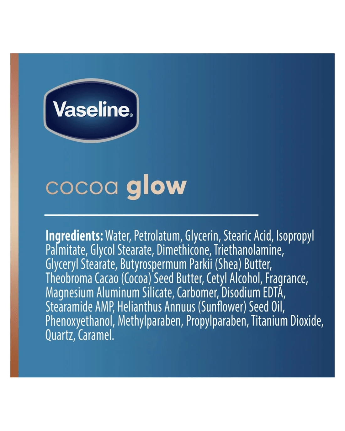 - Ingredients: Water, Petrolatum, Glycerin, Stearic Acid, Isopropyl Palmitate, Glycol Stearate, Dimethicone, Triethanolamine, Glyceryl Stearate, Butyrospermum Parkii (Shea) Butter, Theobroma Cacao (Cocoa) Seed Butter, Cetyl Alcohol, Fragrance, Magnesium Aluminum Silicate, Carbomer, Disodium EDTA, Stearamide AMP, Helianthus Annuus (Sunflower) Seed Oil, Phenoxyethanol, Methylparaben, Propylparaben, Titanium Dioxide, Quartz, Caramel