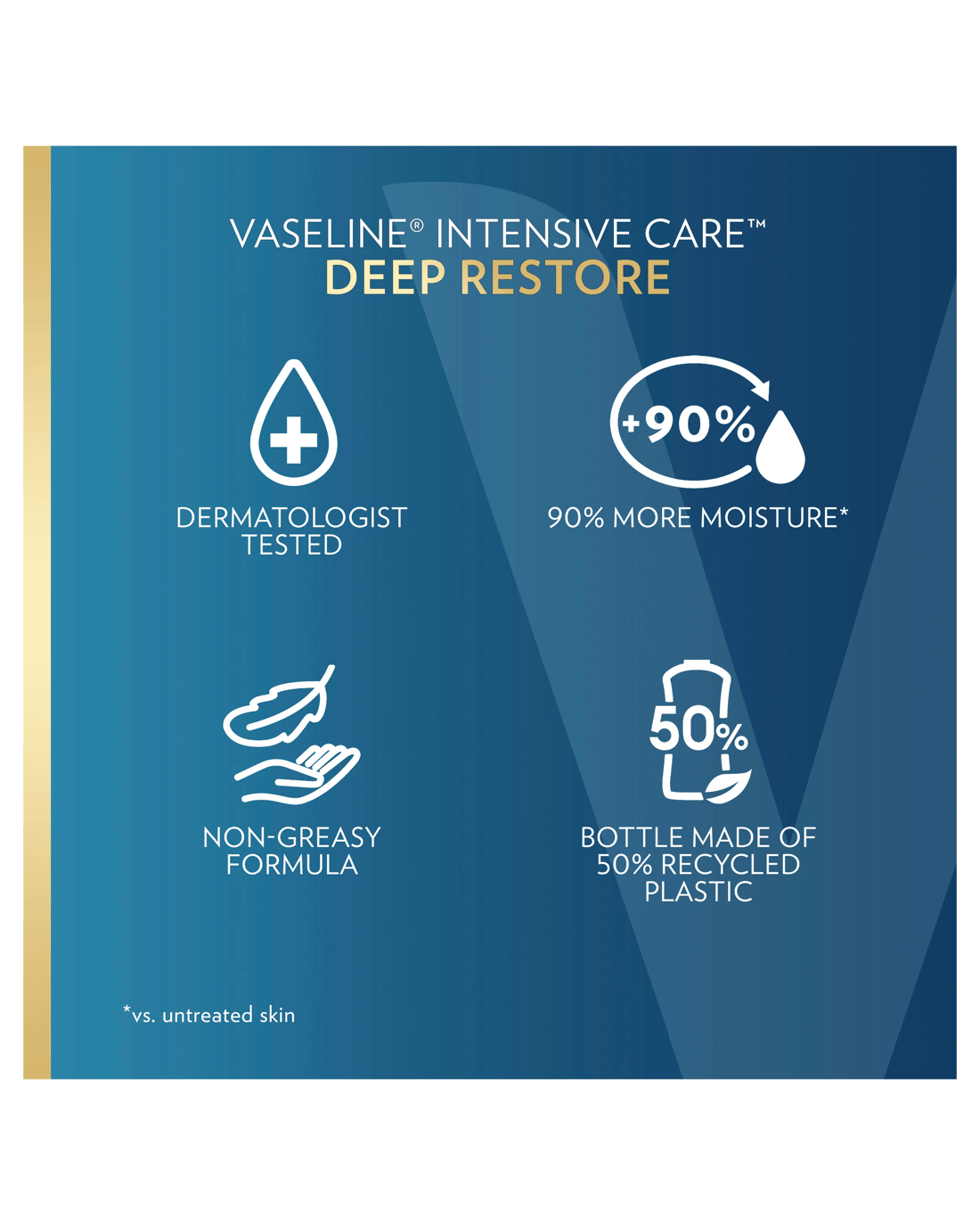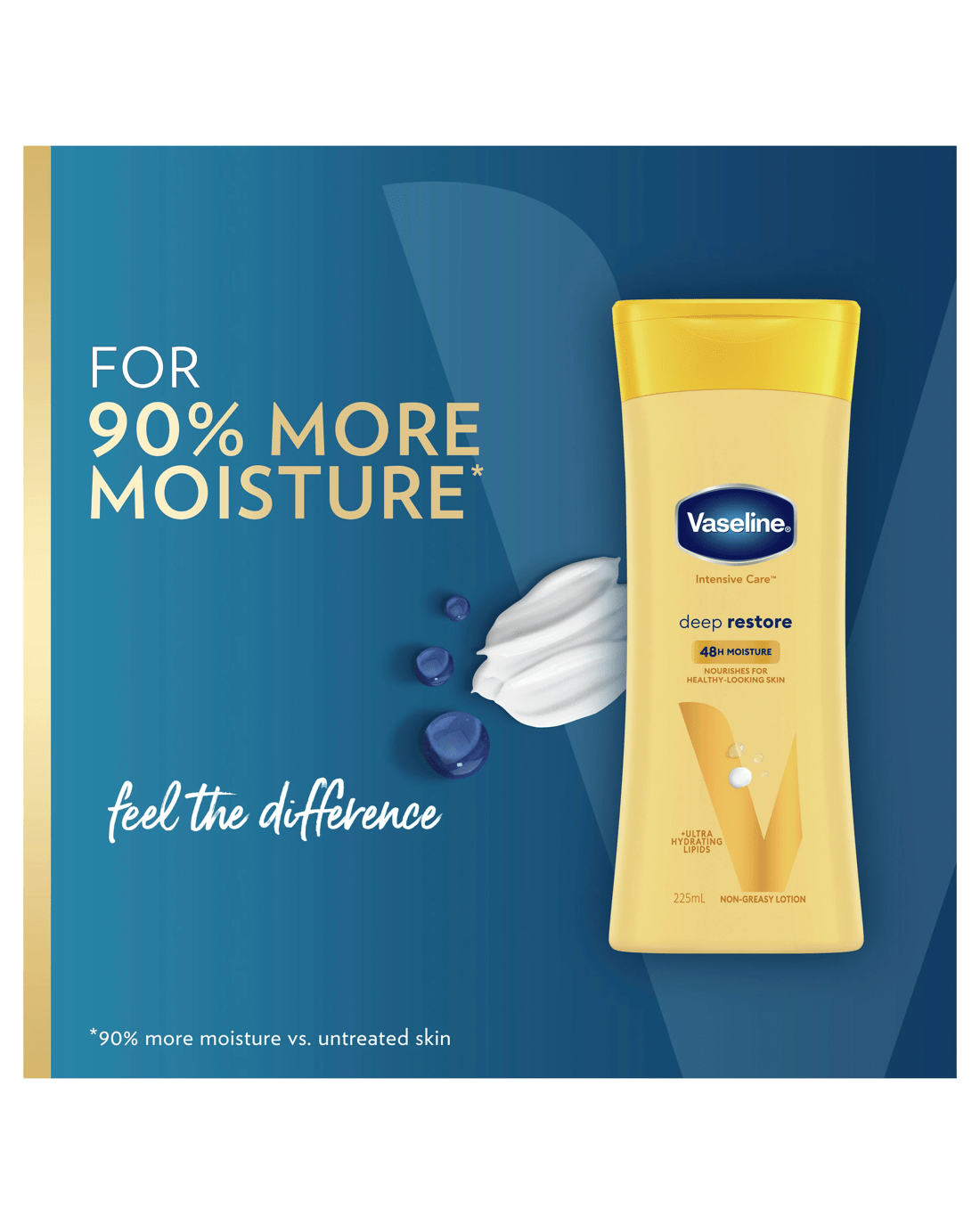 Vaseline Intensive Care Deep Restore Body Lotion locks in moisture and deeply nourishes for healthy-looking skin. Feel the difference - this body moisturiser is clinically tested to provide 90% more moisture (vs. untreated skin). This body lotion for dry skin absorbs fast and provides 48-hour non-greasy moisture. Use this dermatologist-tested body lotion daily on dry, rough skin for stronger, noticeably healthier-looking skin.
