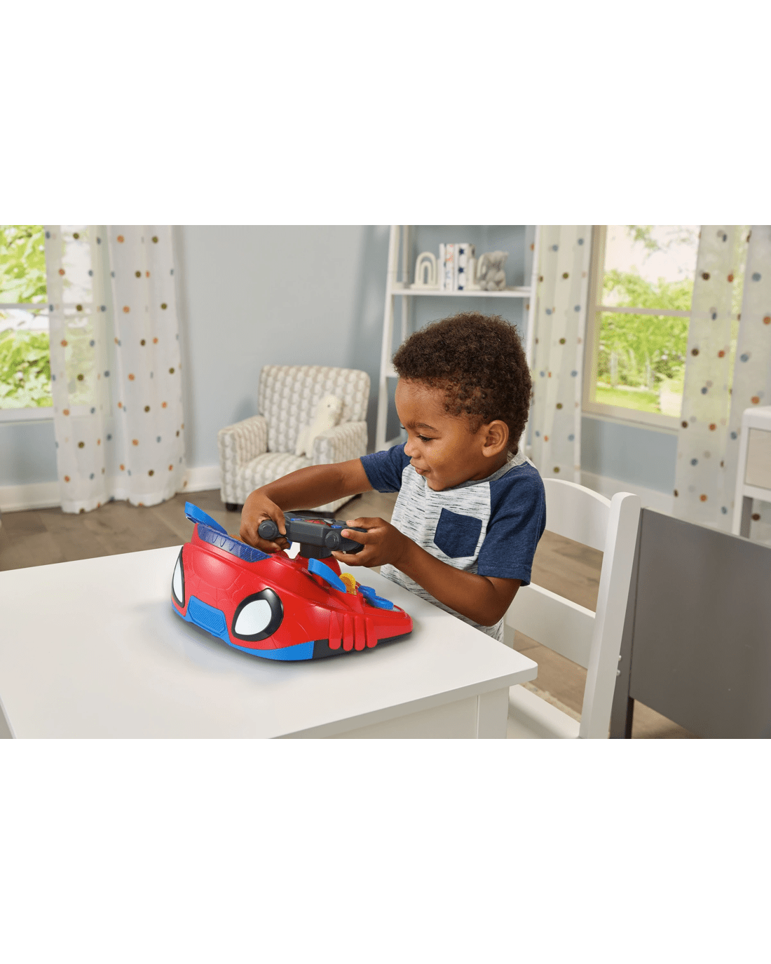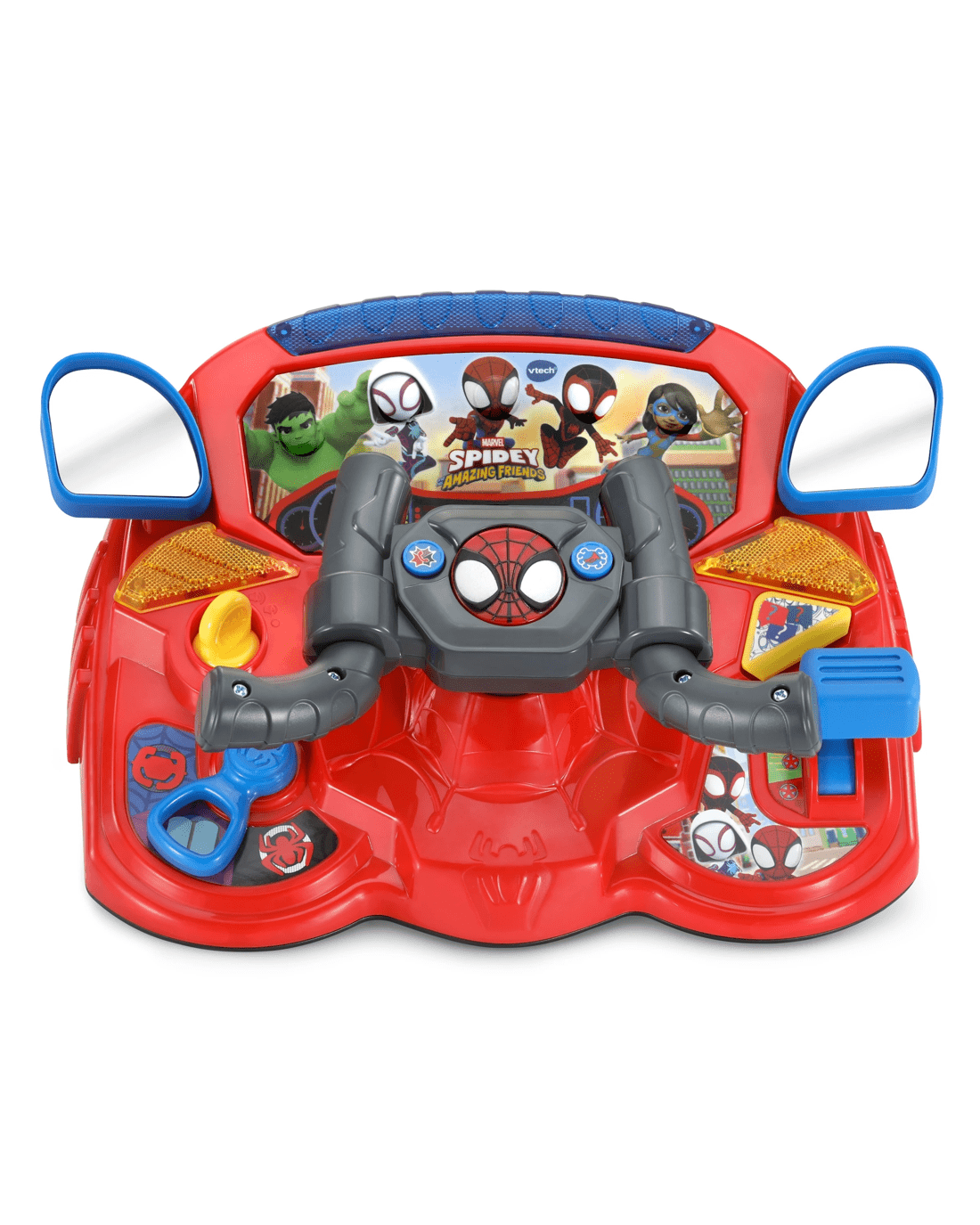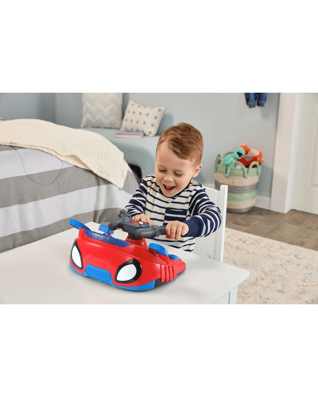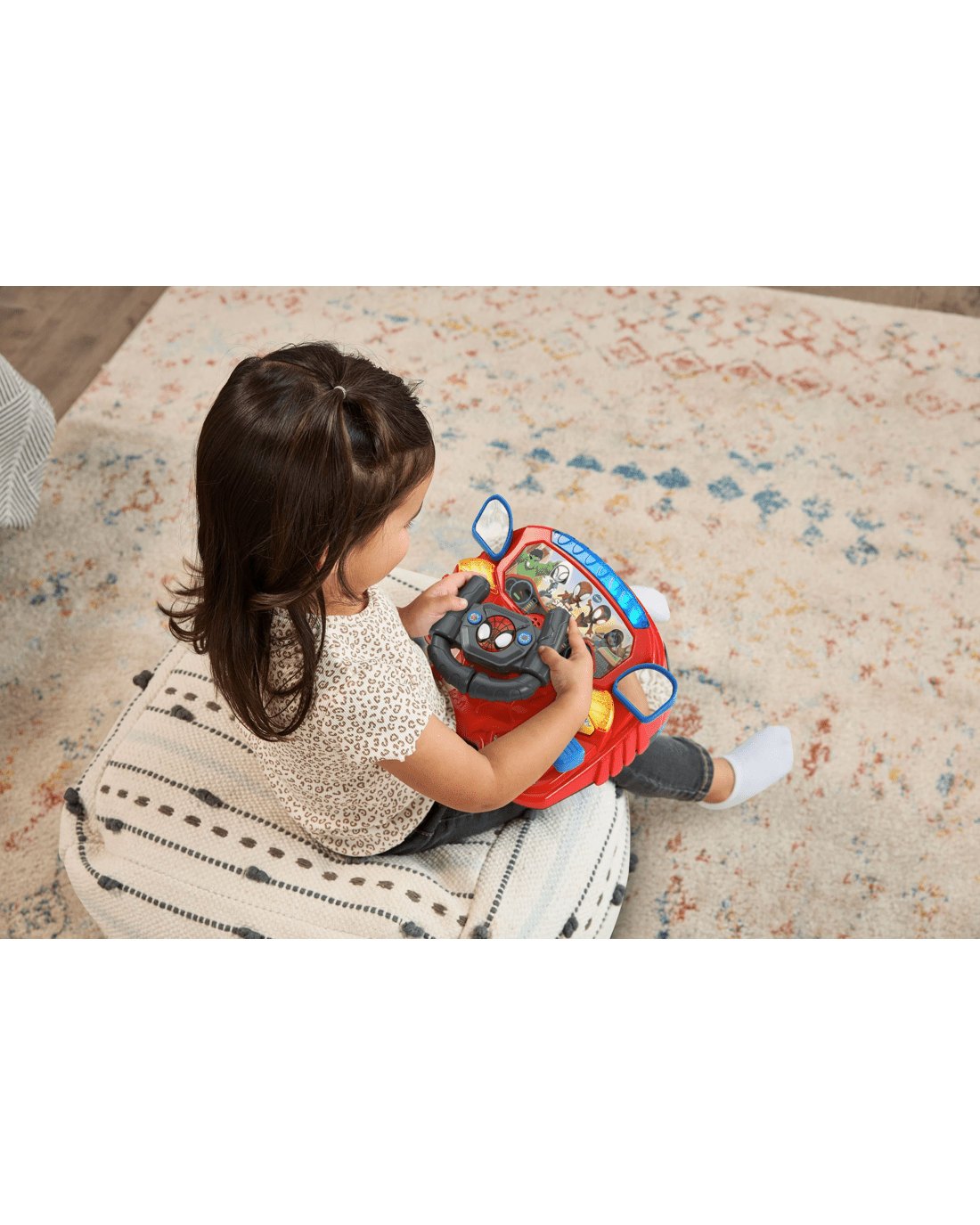 Web out and hop in this 2-in-1 driver that switches between Spidey's Web-Crawler and Spin's Techno-Racer. Turn the steering wheel and explore driving directions, turn signals and traffic lights. Hear super facts about Spidey, Spin, Ghost-Spider, Ms. Marvel and Hulk with voices, phrases and cool sound effects from the show. Complete simple missions or go up against super-villains like Doc Ock, Green Goblin and Rhino in seven action-packed games.