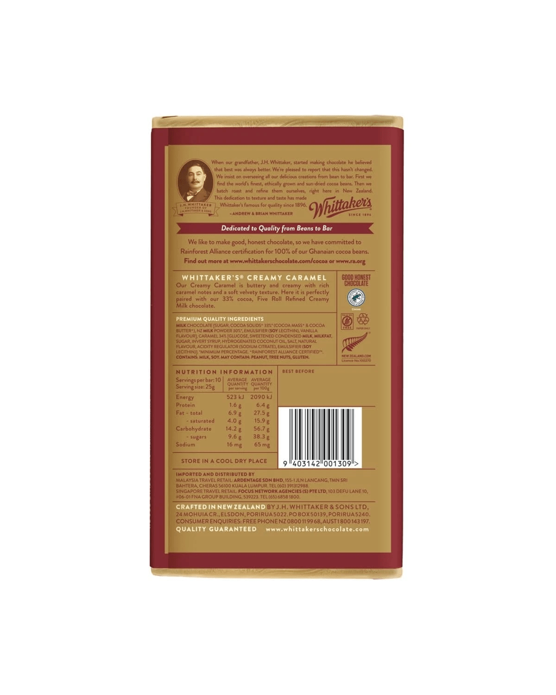 • Ingredients: Milk Chocolate [Sugar, Cocoa Solids⁺ 33% (Cocoa Mass⁺ & Cocoa Butter⁺), NZ Milk Powder 30%*, Emulsifier (Soy Lecithin), Vanilla Flavour]; Caramel 34% [Glucose, Sweetened Condensed Milk, Milkfat, Sugar, Invert Syrup, Hydrogenated Coconut Oil, Salt, Natural Flavour, Acidity Regulator (Sodium Citrate), Emulsifier (Soy Lecithin)]