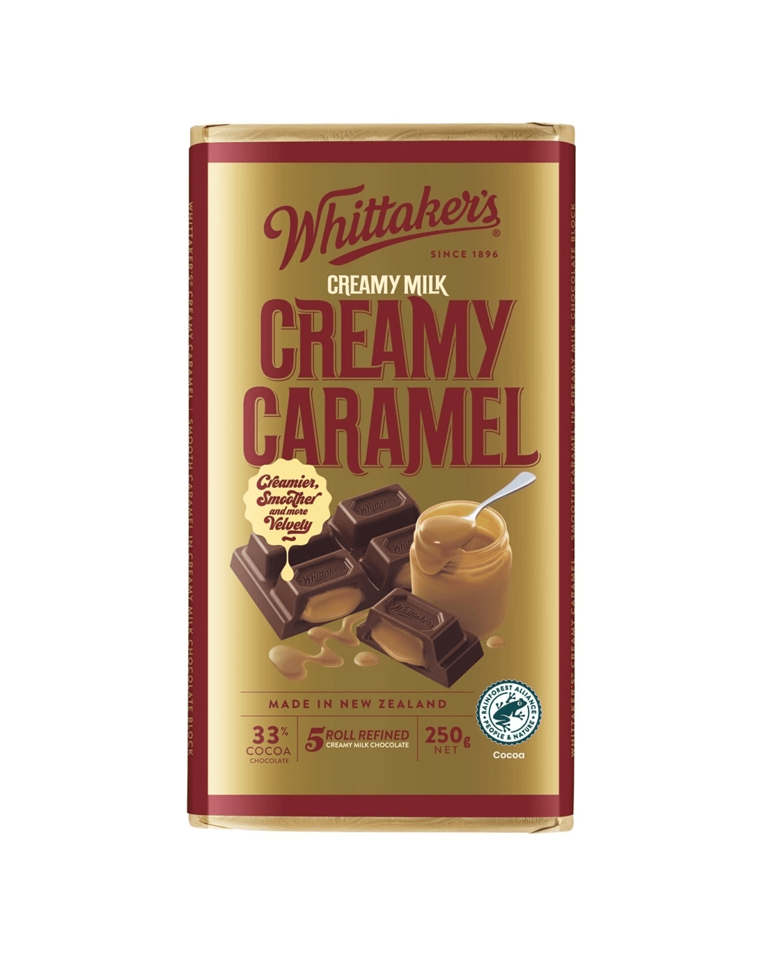 Sweet, flowing rich caramel in 33% cocoa. Enjoy robust, smooth milk chocolate with a hint of caramel in five refined, creamy rolls within our generous 250g block.