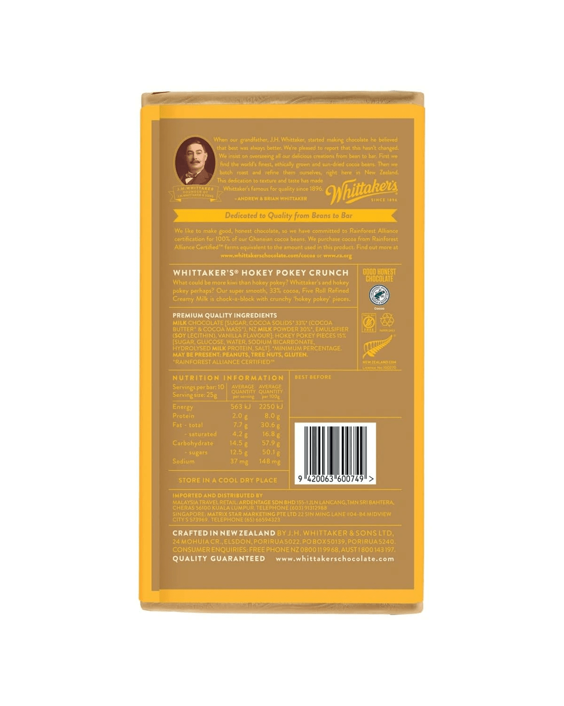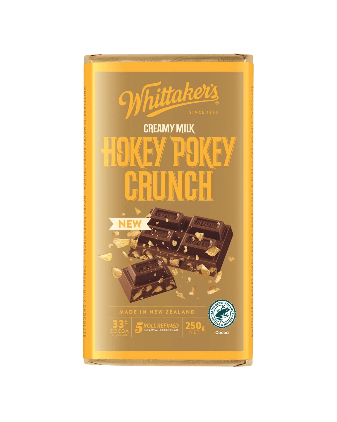 The Whittaker's Hokey Pokey Crunch Creamy Milk Chocolate Bar - our smooth 33% cocoa Creamy Milk Chocolate filled with crunchy honeycomb Hokey Pokey pieces in a generous 250g block. What could be more Kiwi?
