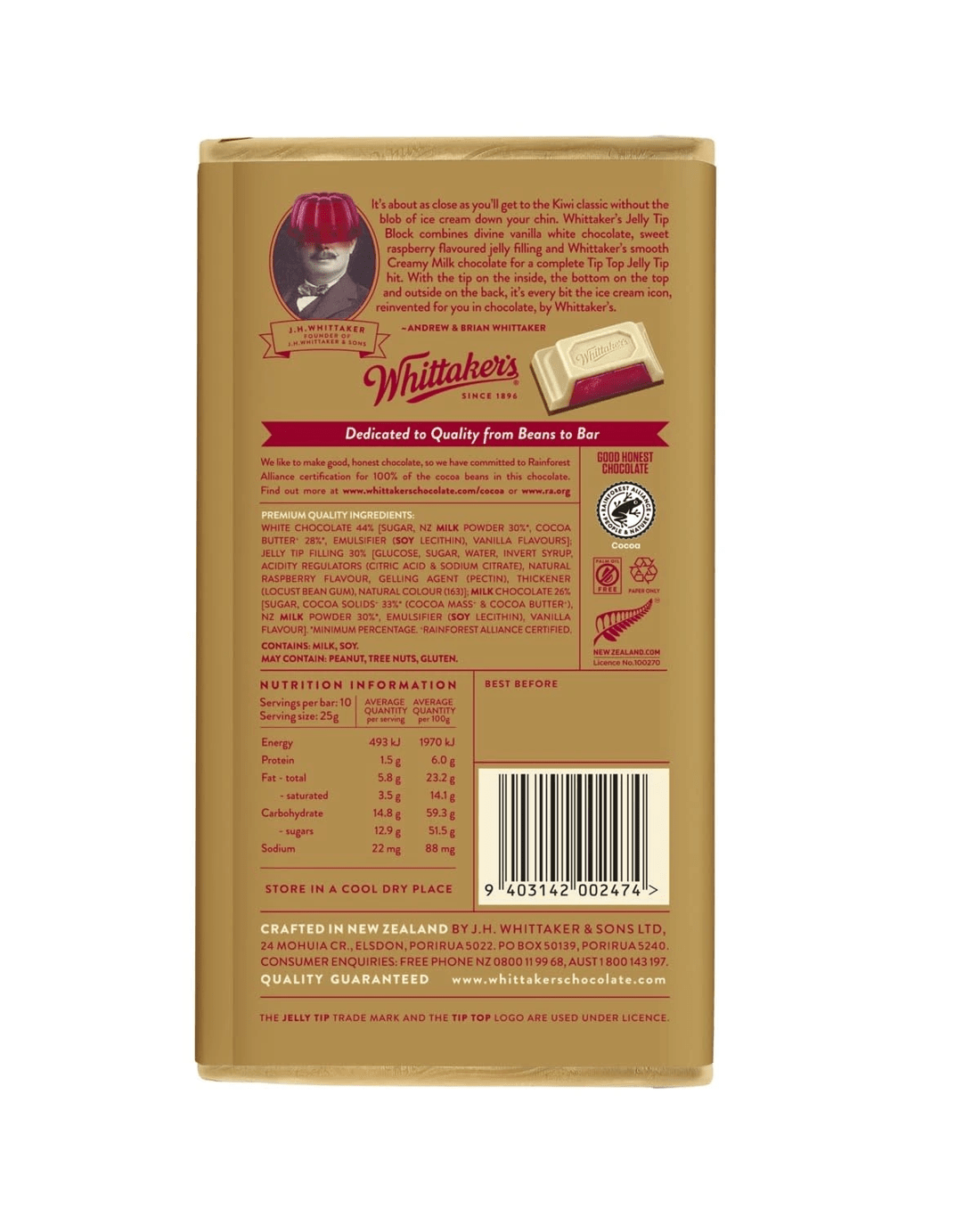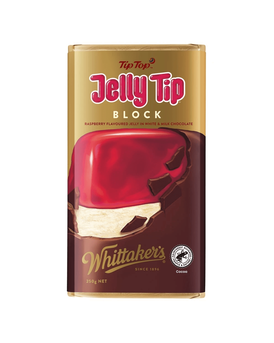 The Kiwi classic, reinvented in chocolate. Enjoy our 28% cocoa sweet vanilla white chocolate on top, raspberry jelly in the middle and 33% cocoa robust smooth five-roll refined creamy milk chocolate with a hint of caramel on the back in our generous 250g block.