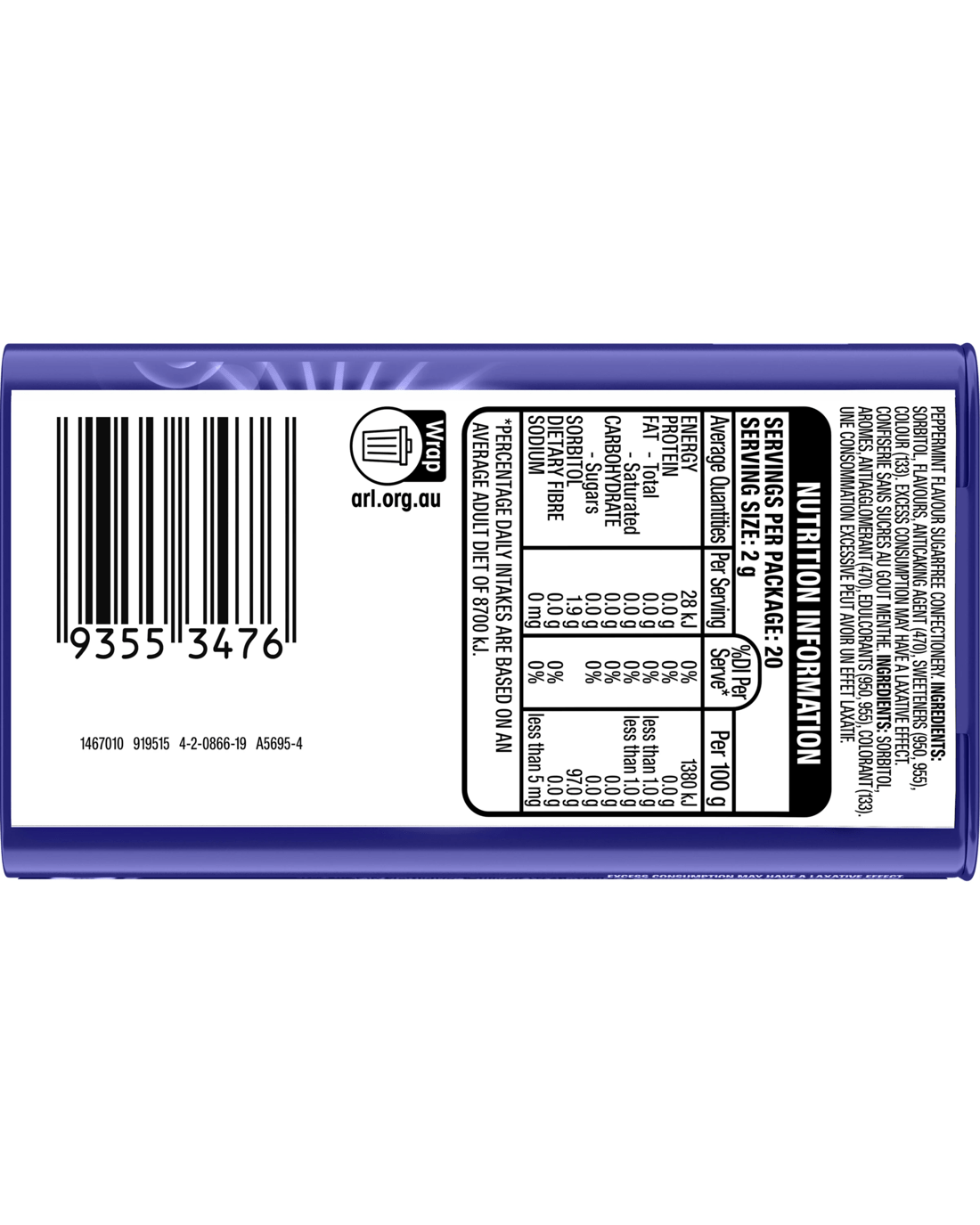 - Ingredients: Sorbitol, Flavours, Anticaking Agent (470), Sweeteners (950, 955), Colour (133)