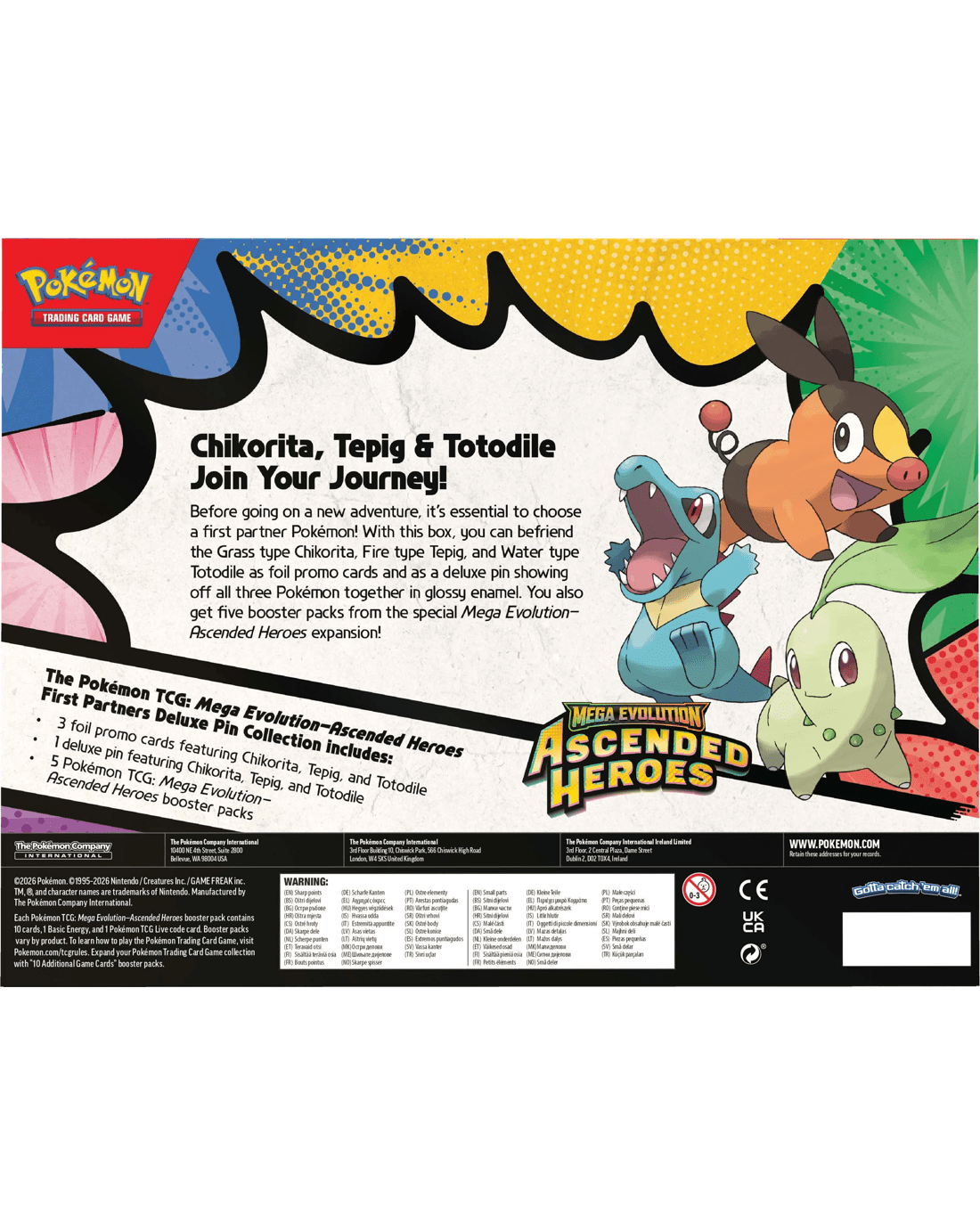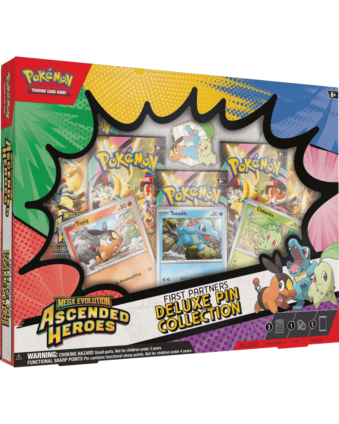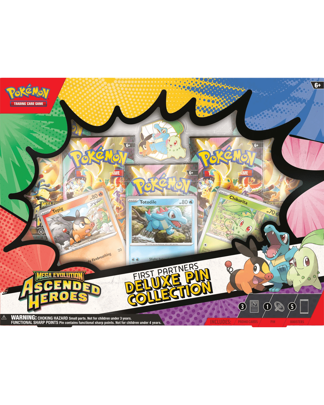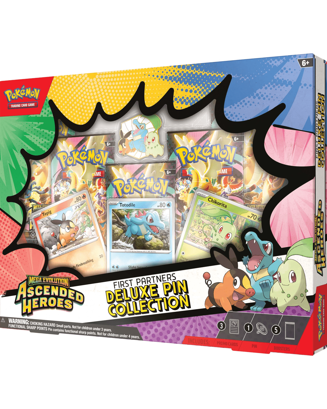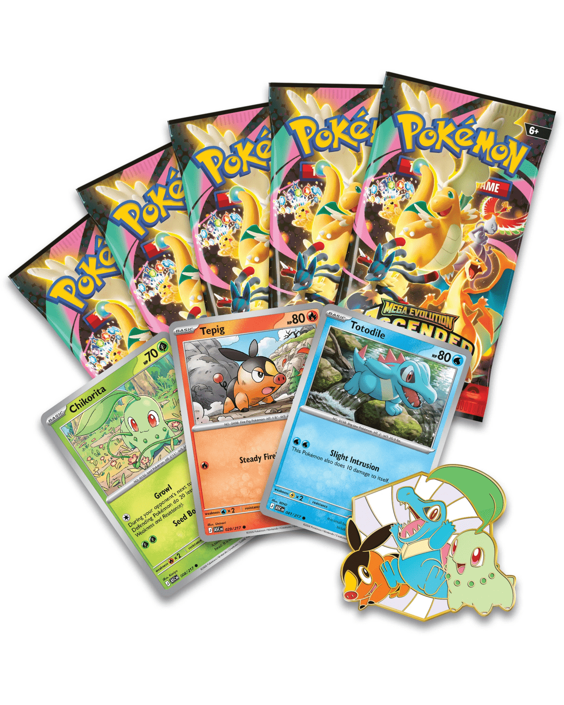 - Includes 3 x foil promo cards featuring Chikorita, Tepig and Totodile, 1 x deluxe pin featuring Chikorita, Tepig and Totodile and 5 x Pokemon TCG: Mega Evolution - Ascended Heroes booster packs