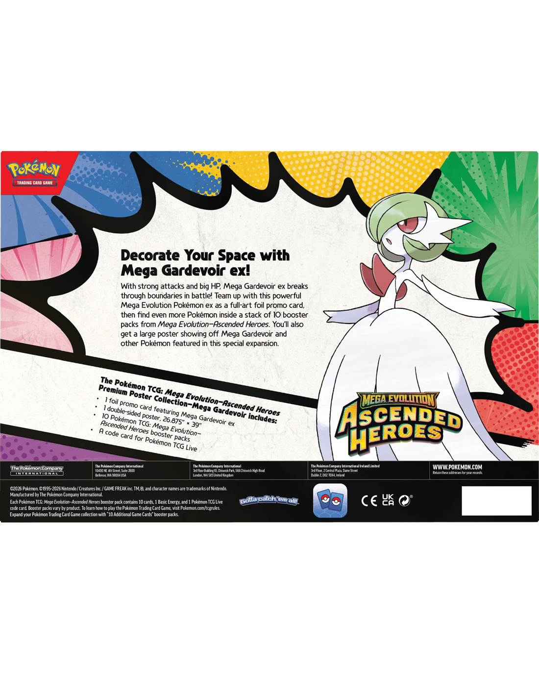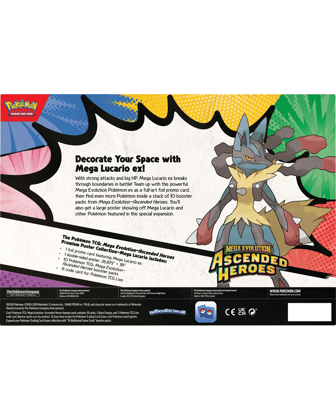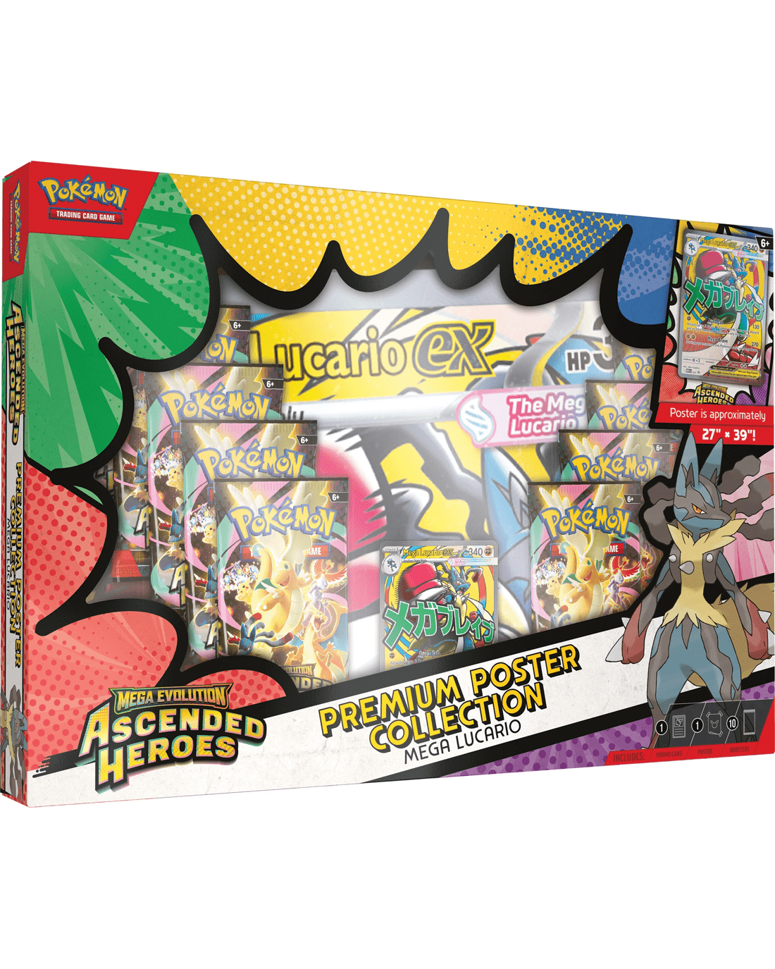 - Includes 1 x foil promo card featuring Mega Lucario ex or Mega Gardevoir ex, 1 x double-sided poster, 10 x Pokemon TCG: Mega Evolution - Ascended Heroes booster packs and 1 x code card for Pokemon TCG Live