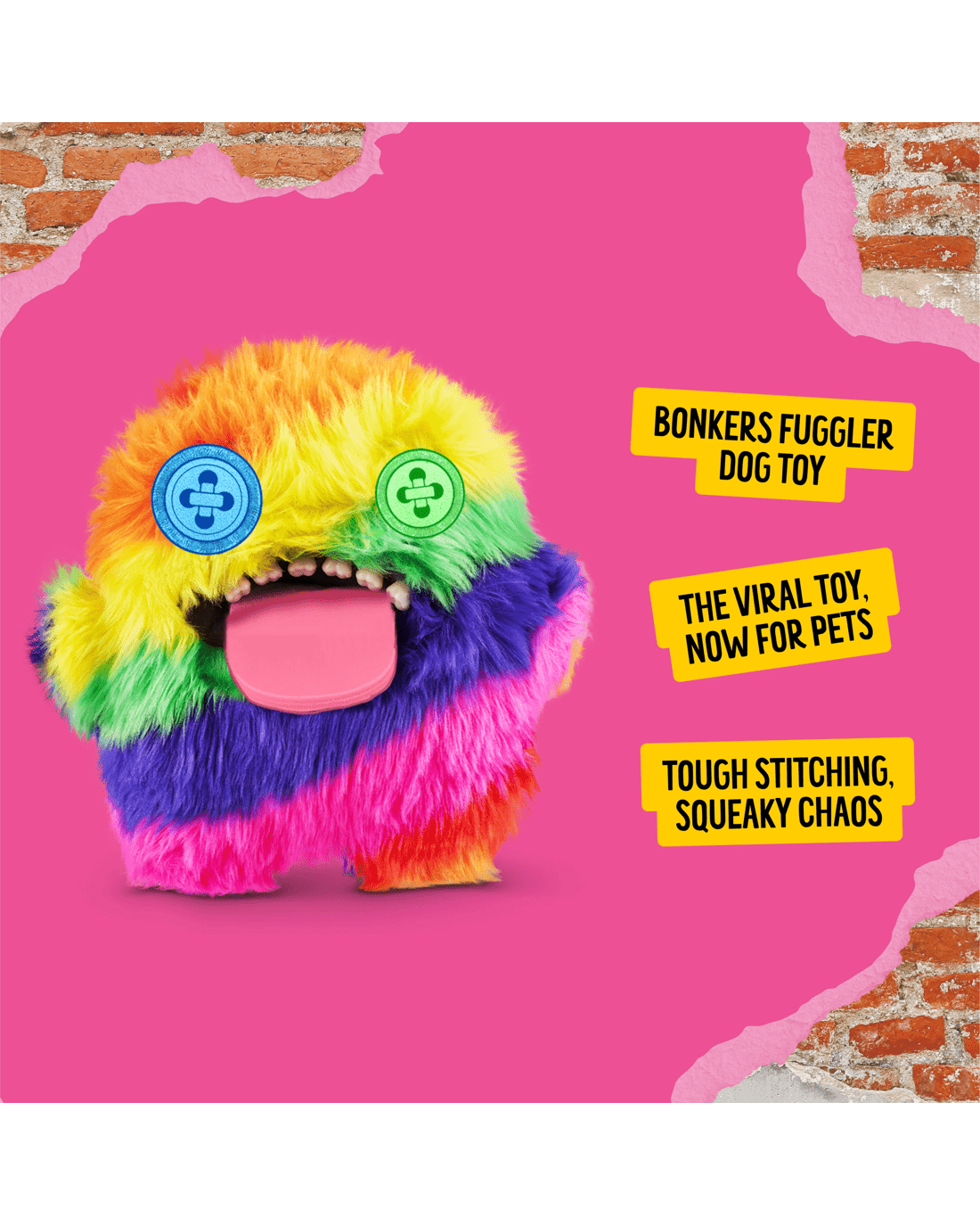 Bonkers Fuggler is not your average dog toy. Some toys dream of cuddles. Bonkers Fugglers dream of being devoured by slobbery jaws and tossed into a tornado of chaos. Tough enough to survive a stampede, squeaky enough to make your dog question reality and deranged enough to enjoy it, this toy is here for one purpose— maximum chompocalypse. Whether your dog’s into chewing, tugging, or causing a scene in the living room, this plush toy was made for maximum mayhem. It’s the kind of toy that gets dragged everywhere, slept on and is never too far from your dog’s side.