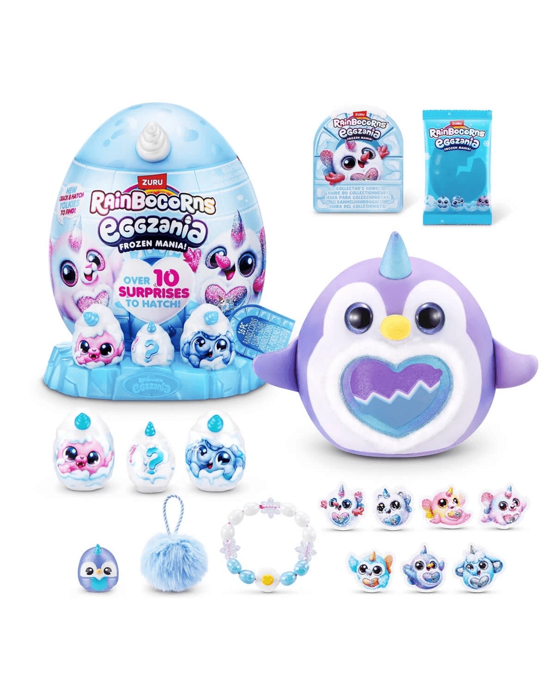 - Includes 1 x Rainbocorns Eggzania Frozencorn Mania plush, 1 x ice base, 1 x egg, 3 x yolkie, 1 x pack Rainbocorns slime, 1 x pack of beads, 1 x string, 1 x furry hair tie, 1 x tag, 3 x stickers and 1 x collectors guide